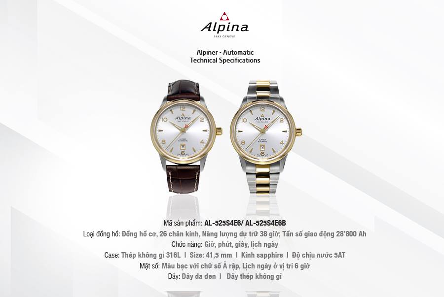 AL-525S4E6 mang thiết kế cổ điển với mặt đồng hồ hình tròn trang nhã. Các cọc số, kim chỉ giờ và phút được vót nhọn sắc sảo. Phần đuôi của kim giây được chế tác theo hình tam giác, phủ lên màu đỏ nổi bật trên nền đồng hồ trắng bạc. Alpina tạo cho mặt đồng hồ của AL-525S4E6 sự tinh tế nhờ vào việc tối giản các chi tiết nhưng vẫn không quên khẳng định đẳng cấp của mình với dòng chữ Swiss Made ở vị trí 6 giờ. Để trở thành một mẫu dresswatch hoàn hảo, Alpina trang bị trên AL-525S4E6 dây da đen thanh lịch đi kèm với đó là đường kính mặt vừa phải, chỉ 41,5mm. Trong khi đó, AL-525S4E6B lại trẻ trung và khỏe khoắn hơn với dây đeo màu bạc làm từ thép không gỉ 316L cao cấp. Bộ máy tự động Thụy Sĩ AL-525 trên AL-525S4E6 và AL-525S4E6B có tới 26 chân kính, mức dự trữ năng lượng là 38 giờ, mang tới khả năng vận hành bền bỉ và chính xác.