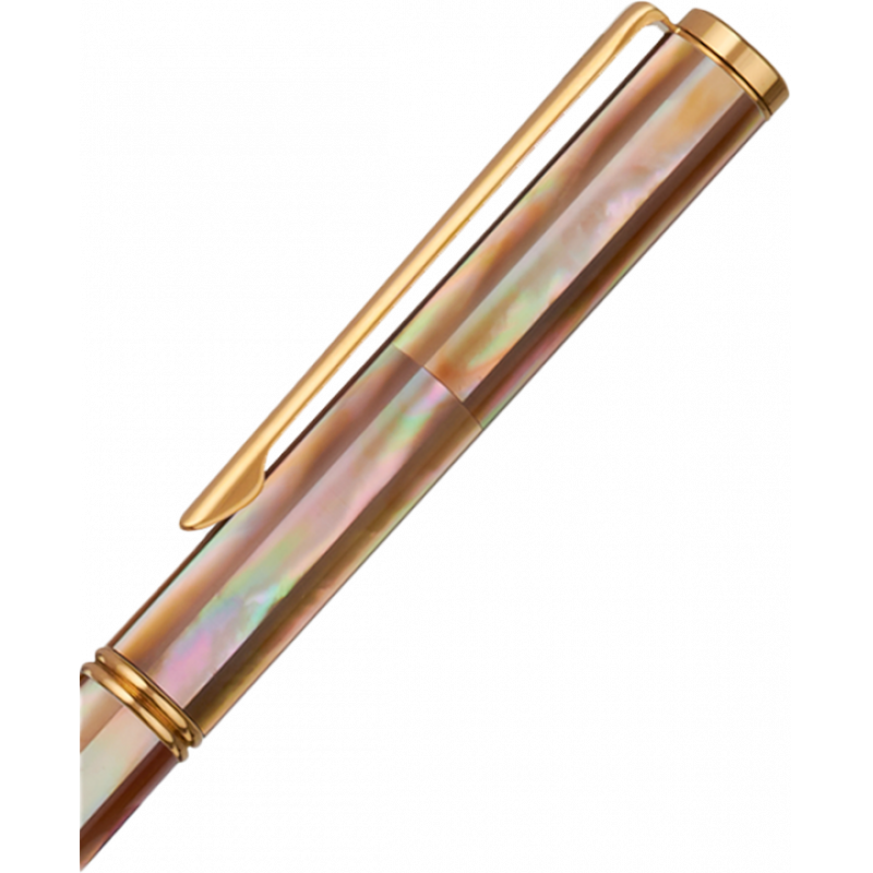 Thân bút được khảm ngọc trai tím Mississippi với bề mặt xử lý mịn, tạo cảm giác liền mạch khi chạm vào. Các khoen kim loại mạ Titanium Gold đóng vai trò điểm nhấn, làm nổi bật nền tím trầm đầy chiều sâu.