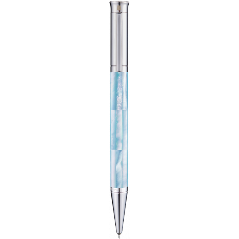 Lớp mạ vàng trắng trên nắp bút, cài bút và chóp bút tạo nên tổng thể hài hòa với nền xanh Alice Blue. Khác với vàng truyền thống mang sắc ấm nổi bật, vàng trắng mang đến cảm giác thanh thoát, hiện đại và chuyên nghiệp.