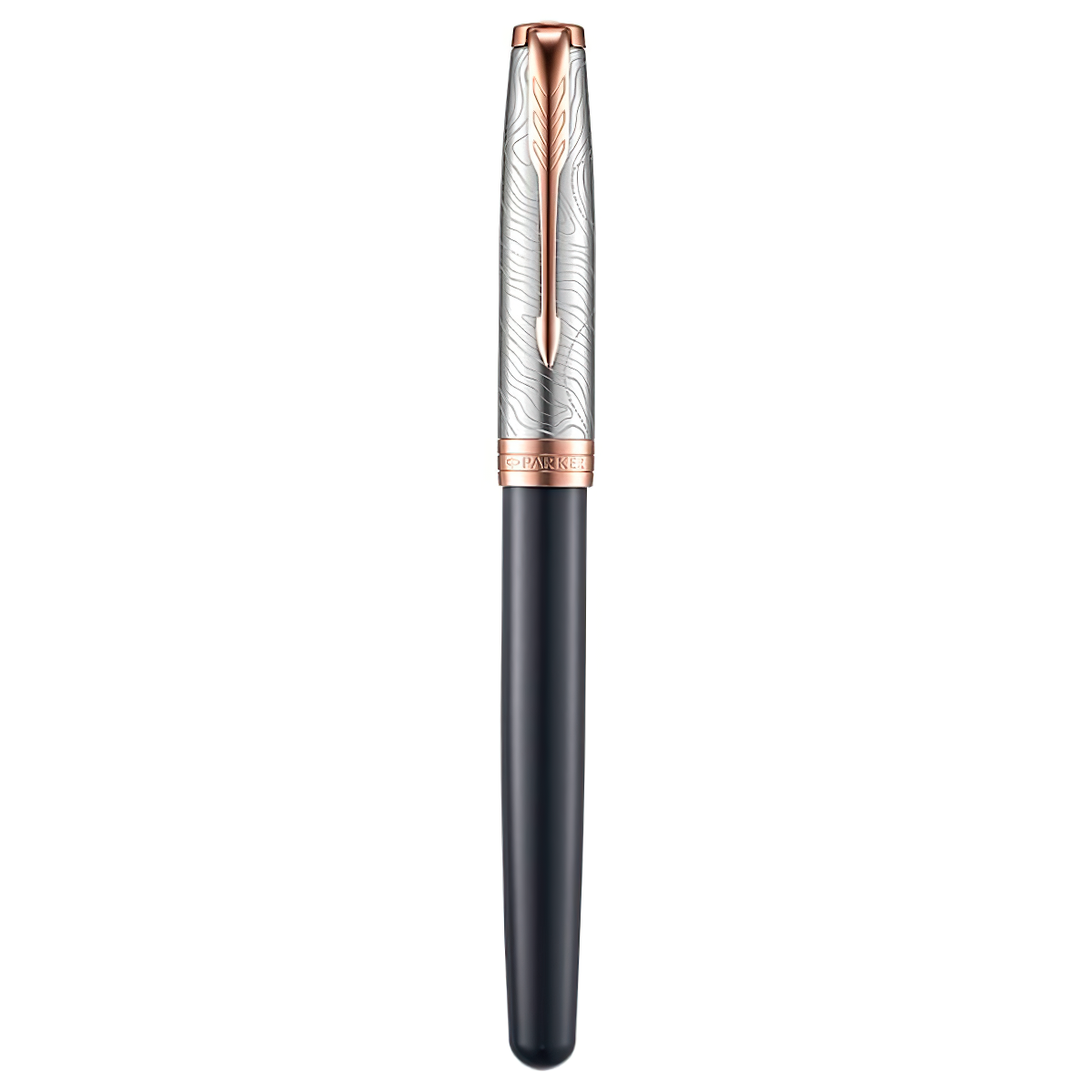Bút máy SON SE18 Grey PGT 18K GB-2054827 là một sản phẩm tiêu biểu trong bộ sưu tập Sonnet. Thân bút được thiết kế nổi bật với hai tông màu đen và bạc, riêng phần nắp bút được chạm khắc hoa văn lượn sóng sắc nét kết hợp thêm giắc cài mạ vàng hồng 18K hình mũi tên, càng làm cho diện mạo của GB-2054827 thu hút mọi người dùng.