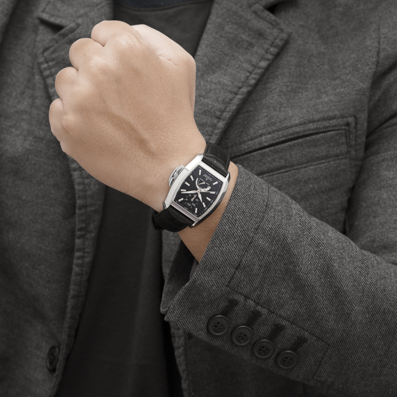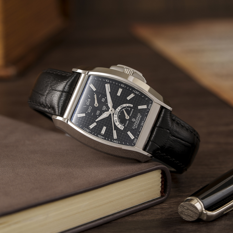 C4303/E sở hữu thiết kế thể thao lạ mắt với mặt số màu đen nam tính kết hợp cùng vân guilloche sang trọng. Biểu tượng rẻ quạt ở góc 6h của sản phẩm chính là bộ đo cót, hay còn gọi là thang đo năng lượng dự trữ (Power Reserve ), giúp chủ nhân của chiếc đồng hồ biết được khi nào cần lên giây cót, và lên bao nhiêu là đủ. Và chính vì sở hữu chiếc thang đo năng lượng dự trữ đó mà ngoài tính năng Automatic, C4303/E còn sở hữu tính năng lên cót bằng tay (Hand-winding). Ở góc 12h của C4303/E là một đồng hồ nhỏ khác, hiển thị 24h trong ngày, chiếc đồng hồ nhỏ này sẽ giúp người đeo nhận biết đồng hồ đang hiển thị thời gian ban ngày hay ban đêm để thuận tiện cho việc chỉnh giờ. Bộ kim phút kim giờ và cọc số của đồng hồ có chứa dạ quang hỗ trợ người đeo xem giờ trong điều kiện thiếu ánh sáng. Đây là một chiếc đồng hồ có thiết kế khá độc đáo và bắt mắt, kết hợp cùng dây da đen và chất liệu vỏ bằng thép không gỉ 316L mang tới sự trẻ trung, khỏe khoắn cho người đeo.