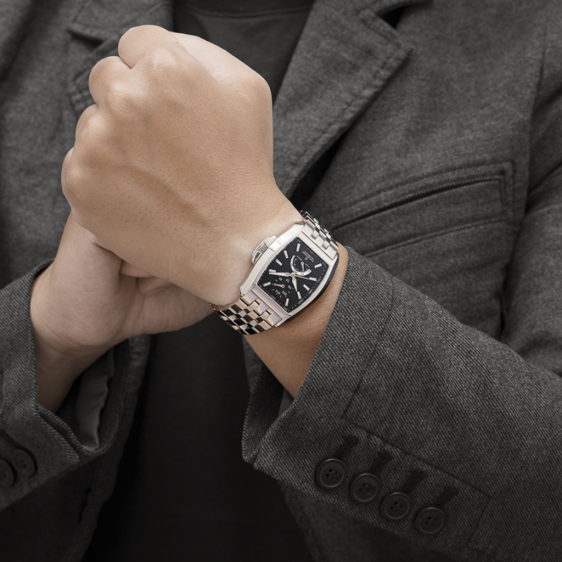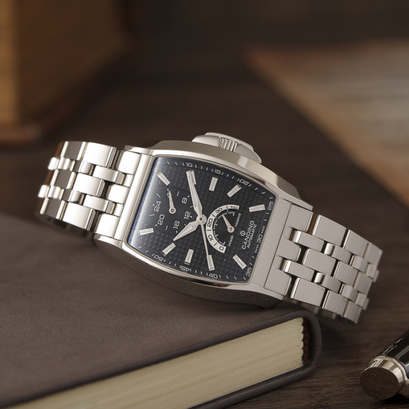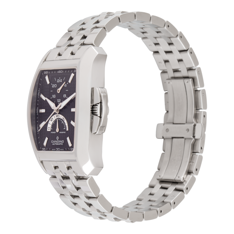 C4304/E nằm trong BST các mẫu đồng hồ Automatic của Candino, là phiên bản dây kim loại của chiếc C4304/E . Sản phẩm sở hữu thiết kế thể thao lạ mắt với mặt số màu đen nam tính kết hợp cùng vân Guilloche sang trọng. Biểu tượng rẻ quạt ở góc 6h của sản phẩm chính là bộ đo cót, hay còn gọi là thang đo năng lượng dự trữ (Power Reserve ), giúp chủ nhân của chiếc đồng hồ biết được khi nào cần lên giây cót và lên bao nhiêu là đủ. Và chính vì sở hữu chiếc thang đo năng lượng dự trữ đó mà ngoài tính năng Automatic, C4304/E còn sở hữu tính năng lên cót bằng tay (Hand-winding). Ở góc 12h của C4304/E là một đồng hồ nhỏ khác, hiển thị 24h trong ngày. Chiếc đồng hồ nhỏ này sẽ giúp người đeo nhận biết đồng hồ đang hiển thị thời gian ban ngày hay ban đêm để thuận tiện cho việc chỉnh giờ. Bộ kim phút kim giờ và cọc số của đồng hồ có chứa dạ quang hỗ trợ người đeo xem giờ trong điều kiện thiếu ánh sáng. Đây là một chiếc đồng hồ có kiểu dáng độc đáo và lạ mắt, tuy nhiên lại khá ôm tay và dễ dàng kết hợp với các kiểu dáng trang phục. Chất liệu dây và vỏ làm bằng thép không gỉ 316L mang tới sự trẻ trung, khỏe khoắn cho người đeo.
