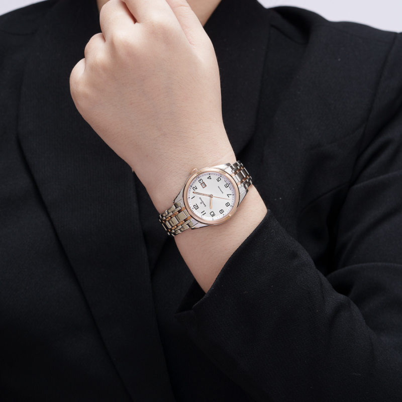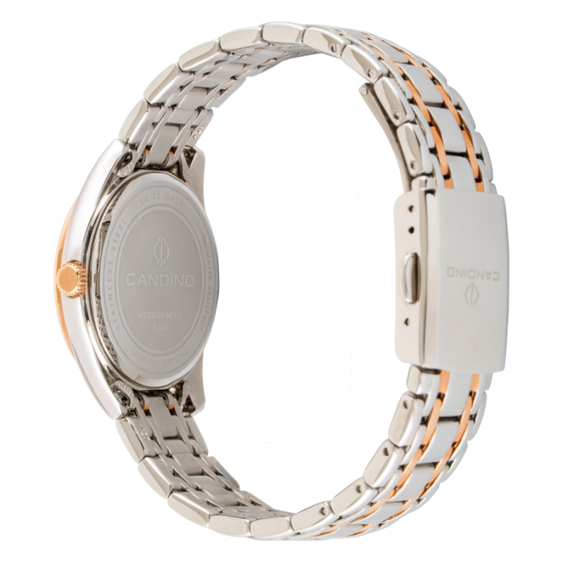 Đồng hồ nữ Candino C4617/1 mang trên mình phong cách đơn giản nhưng vô cùng tinh tế, sản phẩm là sự kết hợp giữa hai màu sắc trắng và vàng hồng, mang đến vẻ đẹp nhẹ nhàng và thanh lịch cho người đeo. Trên nền mặt dial vân sọc trắng là cọc số học trò hiện đại, trẻ trung kết hợp cùng bộ phim bút chì mạ màu vàng hồng được phủ dạ quang ở đầu kim hỗ trợ quý cô xem giờ trong điều kiện thiếu ánh sáng. Cửa sổ lịch nhỏ nhắn nằm ở góc 3 giờ giúp chủ nhân thuận tiện theo dõi các ngày trong tháng. Khung vỏ và dây đeo đều được trang bị chất liệu thép không gỉ 316L - một chất liệu thường được dùng trong y tế đảm bảo an toàn tuyệt đối với vùng da cổ tay ngay cả đối với những khách hàng sở hữu làn da nhạy cảm. Tại mặt viền và dây đeo mạ đờ mi vàng hồng PVD tiên tiến. Trái tim của đồng hồ là bộ máy thạch anh hoạt động chính xác và bền bỉ được bảo vệ bởi khung vỏ kim loại và mặt kính sapphire có khả năng chống trầy xước. Sản phẩm được trang bị mức độ chịu nước 5ATM hỗ trợ người đeo trong các hoạt động rửa tay đi mưa. Thiết kế đơn giản không lo bị lỗi mốt C4617/1 hứa hẹn sẽ đồng hành cùng quý cô qua năm tháng.