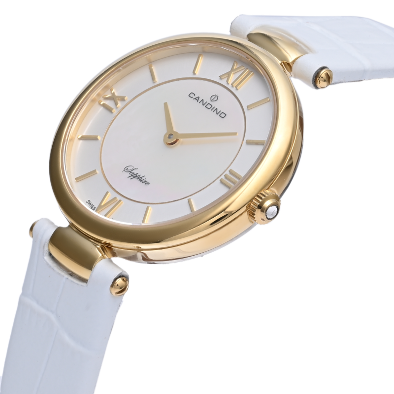 Nằm trong BST Lady Elegance của Candino, mẫu đồng hồ C4670/1 đã thể hiện rõ tinh thần của BST với thiết kế nhã nhặn hướng tới đối tượng là những quý cô yêu thích vẻ đẹp thanh lịch. Candino C4670/1 mang phong cách trẻ trung lấy màu trắng làm chủ đạo được điểm xuyết màu vàng PVD ở phần viền vỏ, bộ kim và cọc số đem đến vẻ sang trọng cho người đeo. Phần lòng trong mặt số đồng hồ được khảm trai một cách tinh tế, tạo hiệu ứng lung linh đa sắc màu theo từng nhịp chuyển động cổ tay. Kết hợp cùng dây da trắng cho quý cô sự trẻ trung, năng động khi lên tay chiếc đồng hồ này. Mức độ chịu nước 5ATM hỗ trợ người đeo trong các hoạt động hằng ngày như rửa tay, đi mưa. Bộ khung case với chất liệu thép không gỉ 316L luôn sáng bóng theo thời gian, không những vậy còn vô cùng lành tính không gây kích ứng dù cho quý cô có sở hữu làn da nhạy cảm nhất. Candino C4670/1 với trái tim là bộ máy Quartz Swiss Made bền bỉ và mặt kính sapphire chống xước hứa hẹn sẽ trở thành người bạn đồng hành cùng quý cô qua năm tháng.