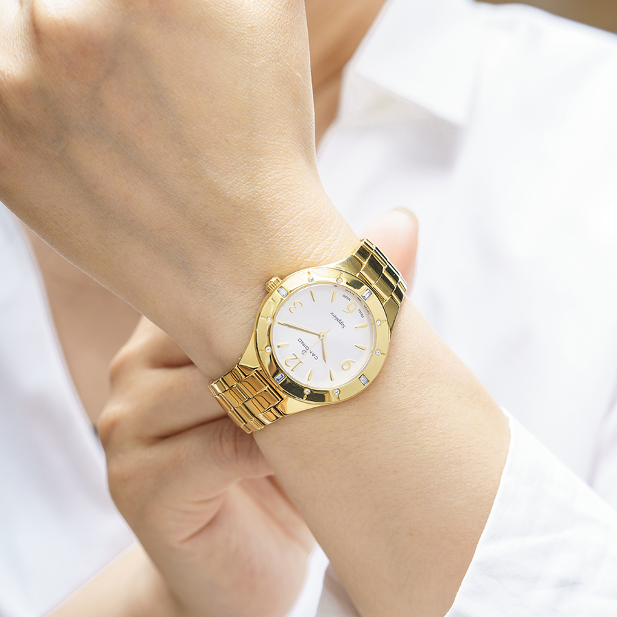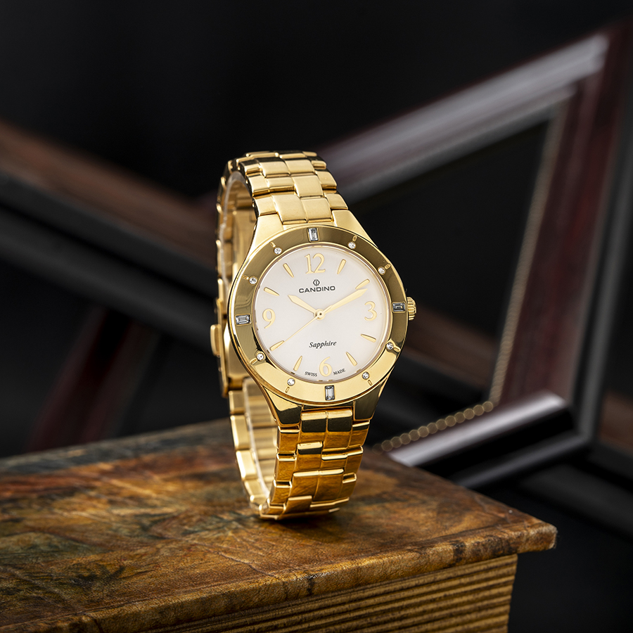 Thuộc dòng đồng hồ thời trang dành cho các quý cô, Candino C4572/1 hiện lên vô cùng nổi bật với sắc vàng kim óng ả bao trùm toàn bộ phần khung vỏ đến bộ dây đồng hồ, đặc biệt được mạ bởi công nghệ PVD cao cấp cho màu mạ được tự nhiên và bền màu qua năm tháng. Mặt số trắng sử dụng dáng kim Dauphine hiện đại, điểm nhấn của chiếc đồng hồ nằm ở phần viền vỏ với mười hai viên đá cao cấp tượng trưng cho mười hai giờ đồng hồ, tạo hiệu ứng lung linh khi trên tay quý cô. Sản phẩm sở hữu mức độ chịu nước là 5ATM, hỗ trợ người dùng trong các hoạt động hằng ngày như rửa tay, đi mưa. Sử dụng chất liệu đá sapphire cho mặt kính luôn sáng bóng qua thời gian, hạn chế tối đa các va đập cùng bộ máy Quartz Swiss Made bền bỉ, C4572/1 hứa hẹn sẽ là người bạn đồng hành cùng quý cô qua năm tháng.
