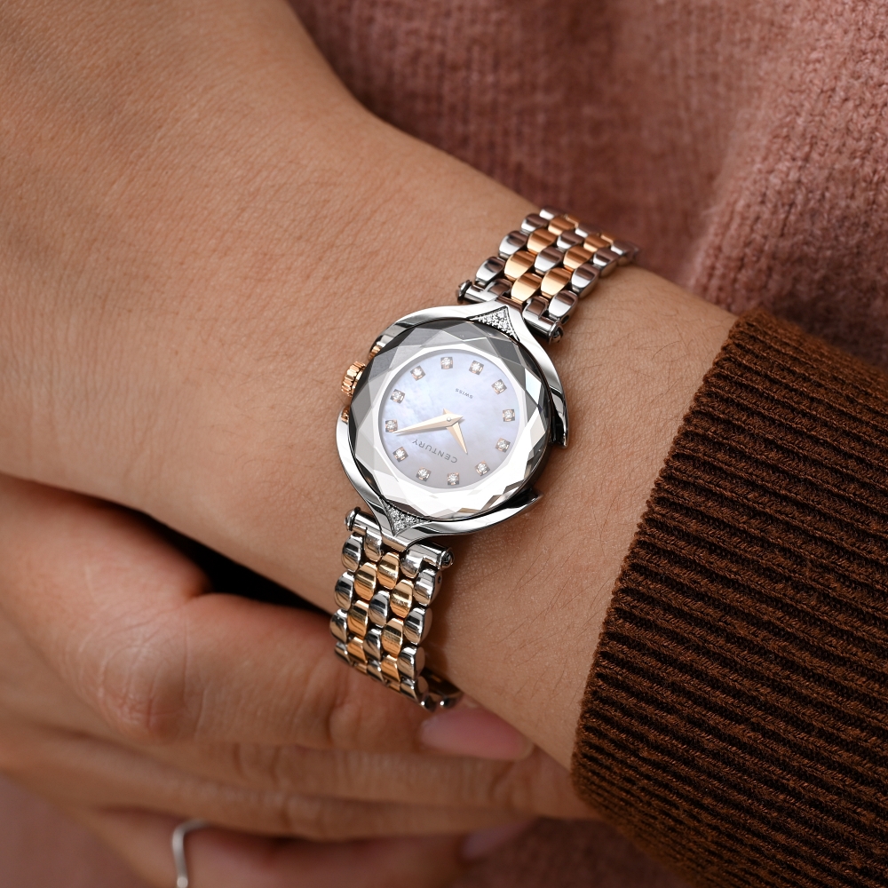 Mang trong mình thông điệp mà Century muốn truyền tải cho những người phụ nữ thanh lịch, BST đồng hồ Affinity sở hữu một diện mạo sang trọng vượt thời gian. Trong đó, mẫu đồng hồ Century 632.7.S.32.16.RSK được trang bị bộ máy Swiss Quartz được bảo vệ bởi khung vỏ chất liệu thép không gỉ 316L và đặc biệt là lớp mặt kính sapphire nguyên khối hình tròn được tạo hình bởi 36 mặt cắt tinh xảo được thủ công khá tinh tế. Toàn bộ lớp mặt kính có kích thước nhỏ nhắn, chỉ 26.2 mm phù hợp với size cổ tay của quý cô Châu Á. Trên nền mặt dial là chất liệu khảm trai màu hạt dẻ được đính 12 viên kim cương tại 12 vị trí giờ tương ứng và 6 viên kim cương khác tại 2 đầu lugs đồng hồ càng nhấn mạnh nét tinh tế, đẳng cấp hoàn hảo cho những quý cô thanh lịch. Dây đeo kim loại vô cùng chắc chắn được mạ màu đờ mi vàng tăng thêm nét đẳng cấp cho dòng đồng hồ luxury.