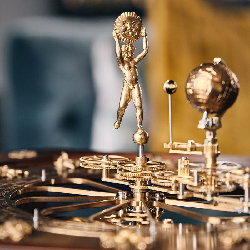 Đồng hồ để bàn 22948-Q10352 được thiết kế mô phỏng quỹ đạo của Trái Đất quay quanh mặt trời trong vòng một năm. Cấu trúc tinh tế của quả địa cầu, mặt trăng, mặt trời và các cung hoàng đạo kết hợp hài hòa. Các chi tiết đều được đánh bóng và tráng men, mạ vàng sáng, mang lại vẻ đẹp bắt mắt, ấn tượng.