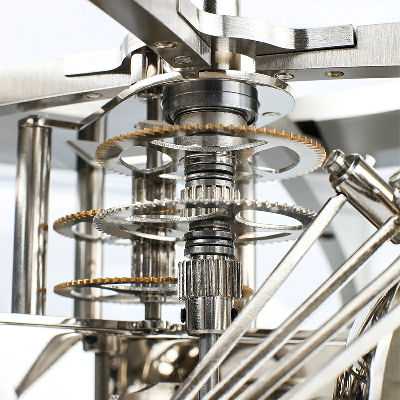 Trên phần đỉnh chóp của đồng hồ, hệ thống mô phỏng lại quỹ đạo của Trái Đất quay quanh mặt trời. Mô hình mặt trăng quay quanh Trái Đất trong 29,5 ngày kết thúc một vòng quay quanh trục của mình, thể hiện được các giai đoạn khác nhau của mặt trăng và Trái Đất cũng đi qua 12 cung hoàng đạo, ngày/tháng - được thể hiện ở phần đĩa phẳng ở phía dưới. Tất cả các chi tiết này đều được gói gọn trong khối cầu hình tròn gợi nhớ đến quả cầu pha lê tuyết lung linh, huyền ảo.