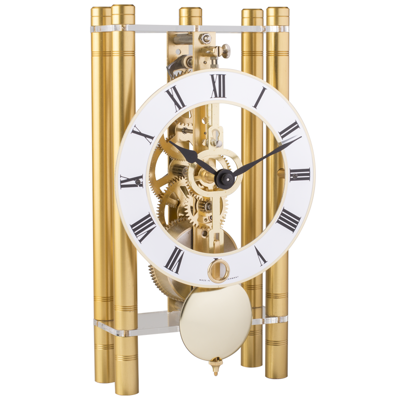 Đồng hồ để bàn Hermle 23020-50072 mang phong cách hoài cổ với thiết kế lộ cơ sang trọng, hòa trộn giữa phong cách hiện đại và cổ điển. Vỏ của mẫu đồng hồ này được làm từ nhôm, 4 trụ nhôm được phủ lớp sơn màu vàng đồng tạo cảm giác hoàng gia được gắn kết bởi 2 tấm kính pha lê ở 2 đầu trên, dưới.