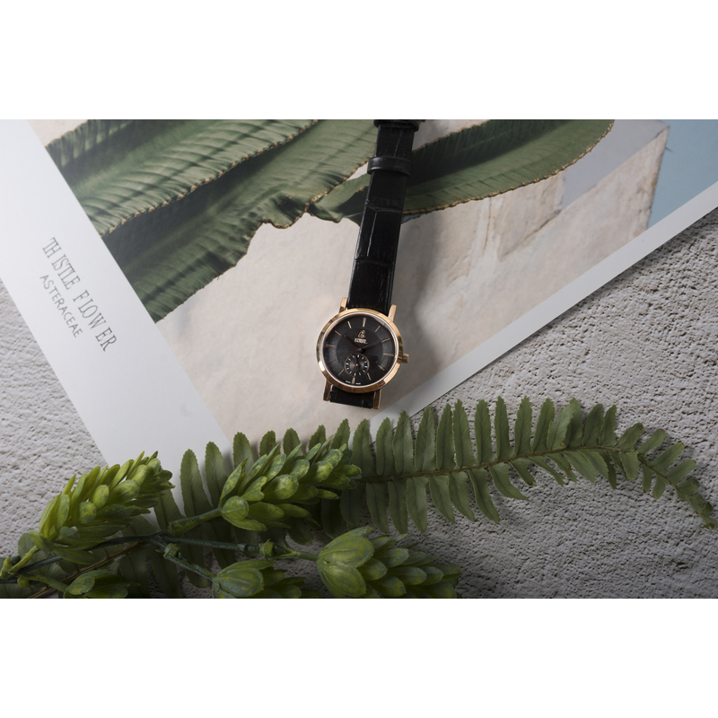 Trong thiết kế đồng hồ Ernest Borel, luôn ẩn chứa những vẻ đẹp tiềm ẩn khiến giới mộ điệu không khỏi say đắm, đặc biệt là những món phụ kiện dành cho phái đẹp, sự đơn giản hiện hữu trong từng thiết kế luôn có một sức hút khó cưỡng, đúng với câu nói “ càng đơn giản càng tinh tế ”. Một ví dụ thiết thực nhất phải kể tới chiếc đồng hồ nữ LGR850N-53591BK, sự uyển chuyển, quyến rũ thể hiện trên từng đường nét vỏ, dây gia công mỏng, nhẹ, sử dụng chất liệu thép không gỉ 316L mạ IP vàng hồng kết hợp dây da bò cao cấp. Chi tiết hiển thị mặt số được chế tác đơn giản với nền đen cá tính. Cọc số vạch form thanh mảnh cùng bộ kim mạ vàng bắt mắt. Kim giây độc lập tách riêng với kim giờ và kim phút đặt tại góc 6h. Trái tim của LGR850N-53591BK là cỗ máy Quartz Swiss Made với độ chính xác và bền bỉ cao.