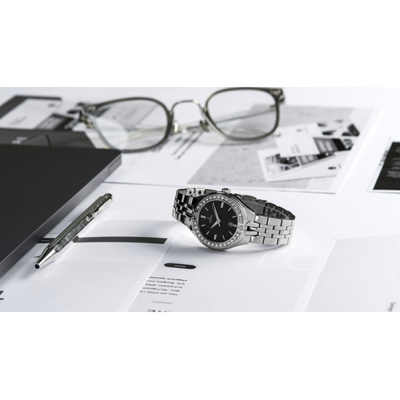 Ấn tượng và tinh tế, sang trọng và thanh lịch, đó là những cảm nhận đầu tiên của các quý cô khi được chiêm ngưỡng mẫu đồng hồ F16867/2. Nằm trong bộ sưu tập Only for Ladies với những mẫu sản phẩm vô cùng nữ tính, không quá ngạc nhiên khi F16867/2 được đại đa số phái đẹp bình chọn “yêu ngay từ cái nhìn đầu tiên”. Gây ấn tượng đặc biệt là thiết kế kết hợp với đá Swarovski được phủ kín viền ngoài giúp cổ tay của phái đẹp luôn phát ra thứ ánh sáng huyền diệu. Trên nền dial đen, bộ kim Dauphine màu trắng tối giản cùng cọc số dạng vạch nhỏ xinh nhằm tạo độ thông thoáng cho khu vực mặt số. Nổi bật hơn cả là viền ô cửa lịch màu trắng cùng tone màu với logo thương hiệu góc 12h giúp đồng hồ có điểm nhấn rõ nét. Dây đeo của đồng hồ sử dụng màu trắng làm chủ đạo giúp đồng hồ càng tôn lên vẻ đẹp thanh lịch vốn có kèm theo bộ khóa bấm thuận tiện và an toàn. Festina sử dụng hoàn toàn chất liệu thép không gỉ 316L trong chế tác giúp phần dây và vỏ nhằm giữ được độ sáng bóng, bền đẹp của sản phẩm theo thời gian. Đặc biệt, loại nguyên liệu này không gây kích ứng da tay, kể cả với những làn da nhạy cảm nhất. Sở hữu đường kính 32mm nhỏ xinh phù hợp với mọi cổ tay người phụ nữ Á Đông cùng độ chịu nước lên tới 50M giúp nàng thoải mái trong những sinh hoạt thường ngày. Trái tim của F16867/2 chính là bộ máy Quartz bền bỉ và được bảo hành 2 năm quốc tế.