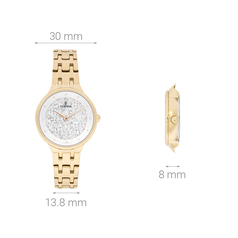 Thời phong kiến, chỉ có những người trong hoàng tộc mới được sử dụng màu vàng. Cho tới hiện nay, sắc vàng hoàng kim vẫn luôn mang tới cảm giác quyền quý, sang trọng bậc nhất trong lĩnh vực chế tác đồ trang sức nói chung và đồng hồ nói riêng. Những chiếc đồng hồ nằm trong bộ sưu tập Mademoiselle mới nhất của Festina đã khéo léo sử dụng màu sắc đó kết hợp với sự lấp lánh mê hoặc của những viên đá Swarovski để tạo nên 2 phiên bản đồng hồ mê hoặc F20383/1 và F20383/2.