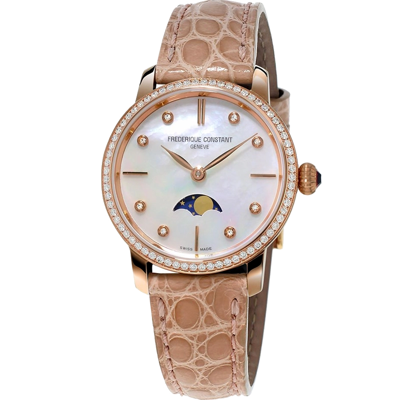 Nổi bật nhất trong BST Slimline Moonphase chính là “quý cô” FC-206MPWD1SD9 khi mang tới sự khác biệt với các sản phẩm khác. Trái tim của đồng hồ là bộ máy quartz mang ký hiệu FC-206 cho thời lượng sử dụng ấn tượng, lên tới 60 tháng. Về ngoại hình, FC-206MPWD1SD9 sở hữu tông màu be chủ đạo từ dây da cá sấu cùng các nguyên liệu đẳng cấp khác như kim cương và mặt khảm trai. Vỏ đồng hồ của FC-206MPWD1SD9 chính là chi tiết đắt giá nhất khi được làm từ vàng hồng 18k sang trọng. Bên cạnh đó, 60 viên kim cương đính quanh vành mặt số cũng góp phần tạo nên một món trang sức xa xỉ cho phái đẹp.