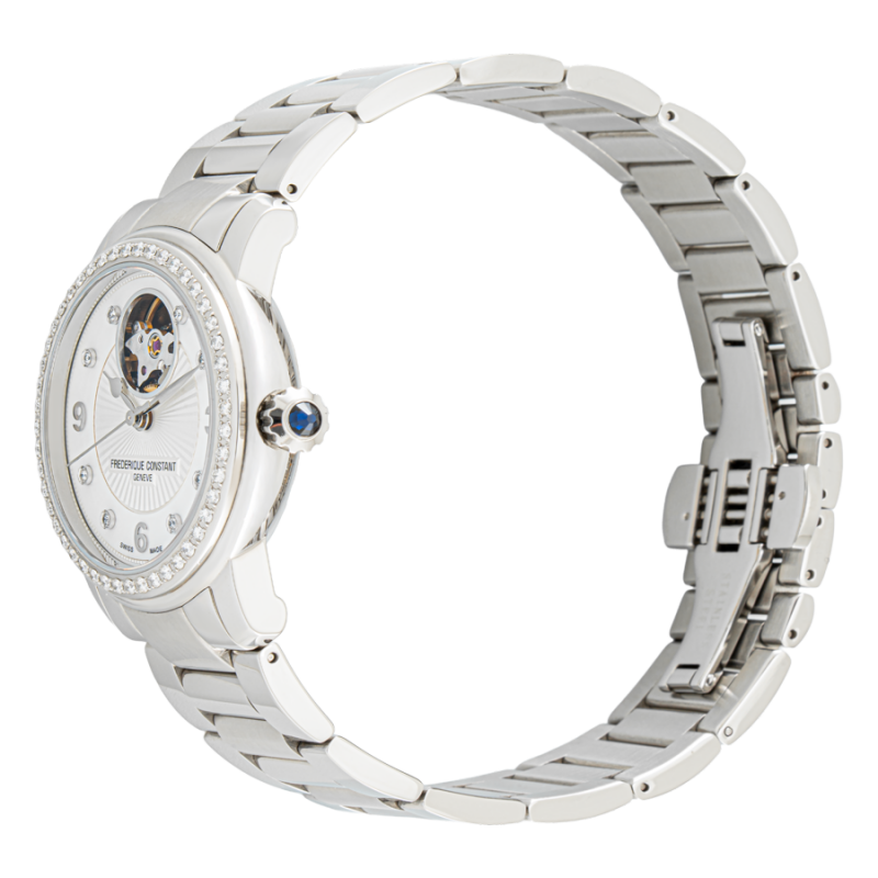 Nằm trong BST Heart Beat và được đông đảo nữ giới mến mộ chính là mẫu đồng hồ FC-310HBAD2PD6B. Được thiết kế với đường kính 34 mm cùng độ dày 9.9 mm phù hợp với cổ tay của đa số quý cô Châu Á, mẫu đồng hồ này còn được trang bị bộ máy cơ lên cót tự động mang ký hiệu FC-310 với 26 chân kính cùng tần số dao động 28’800 alt/h cùng khả năng dự trữ cót lên đến 38 giờ. FC-310HBAD2PD6B mang sắc trắng bạc chủ đạo từ phần mặt số xuyên suốt tới khung vỏ và dây đeo, được làm từ nguyên liệu thép không gỉ 316L chuyên dụng chống ăn mòn cực cao.