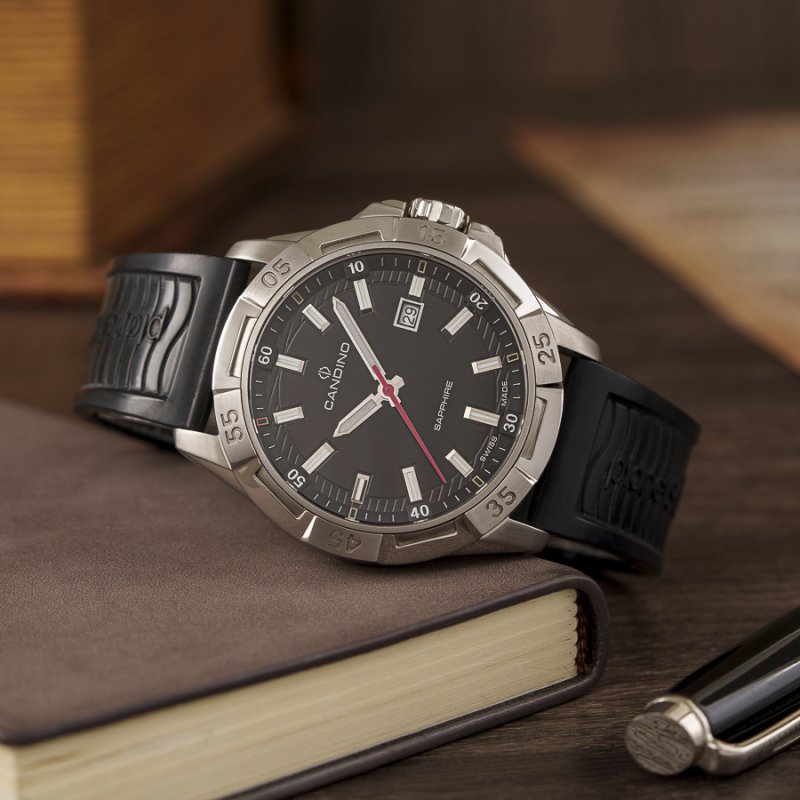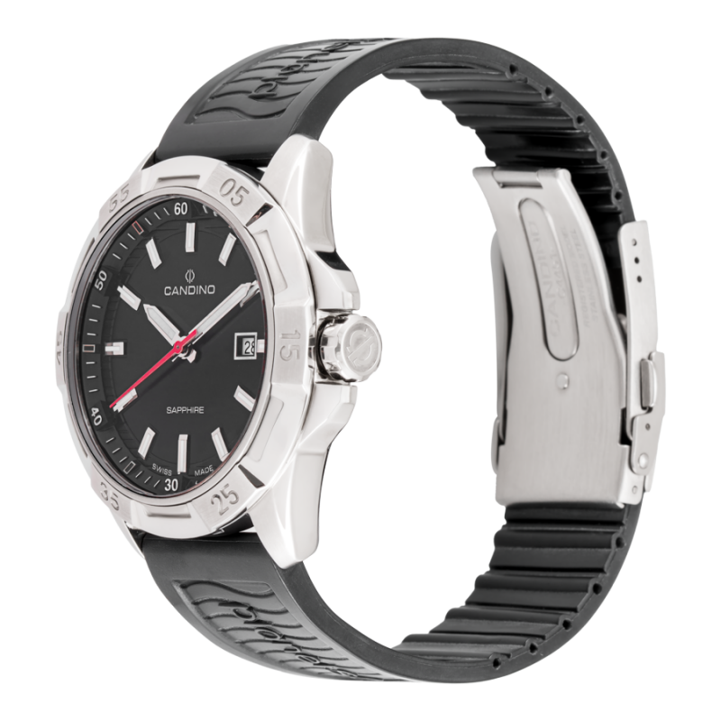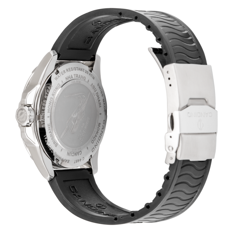Nằm trong bộ sưu tập Planet Solar của Candino, C4497/3 mang đến một tinh thần thể thao vô cùng mạnh mẽ với đường kính mặt lên tới 45mm kết hợp cùng dây cao su PU kháng nước, ôm trọn cổ tay. Mẫu đồng hồ này có thiết kế mặt số đen nam tính cùng kim giây đỏ nổi bật. Ngoài ra, dạ quang nằm ở bộ kim chỉ giờ, phút cùng phần cọc số cũng hỗ trợ người dùng có thể xem giờ ở môi trường thiếu ánh sáng. Đặc biệt, Candino sử dụng chất liệu kính sapphire cho chiếc đồng hồ thể thao này, điều mà chỉ những thương hiệu đắt tiền mới làm được. Sản phẩm sử dụng chất liệu thép không gỉ 316L cho phần vỏ và vòng benzel. Với mức độ chịu nước 20ATM cùng dây đeo cao su, C4497/3 sinh ra để sống cùng chủ nhân trong những hoạt động dưới nước như bơi hay lặn.