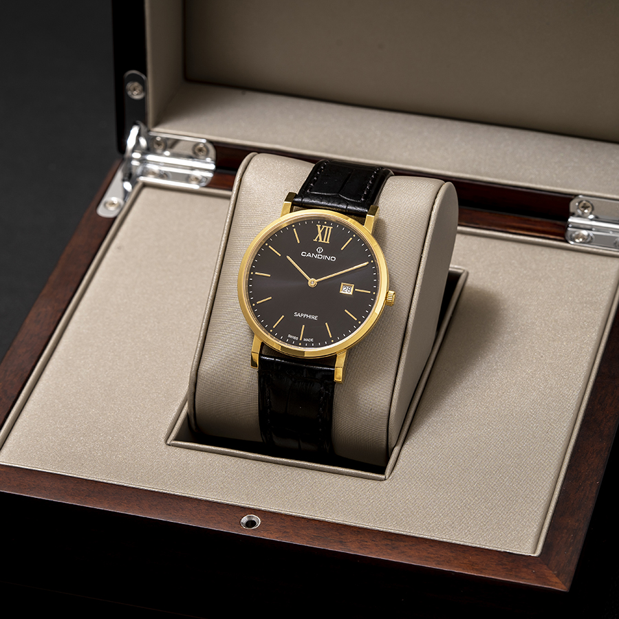 Nằm trong dòng sản phẩm Classics của Candino, chiếc đồng hồ nam C4726/3 có thiết kế khá đơn giản với mặt số đen nam tính, bộ kim và cọc số mạ vàng sáng mang đến cho người đeo một phong cách đơn giản và hiện đại. Đường kính mặt 39,5 phù hợp với mọi loại cổ tay nam giới Châu Á. Chi tiết hiển thị được tối giản khi C4726/3 sở hữu thiết kế 2 kim và 1 lịch ngày với kim giây được lược bỏ. Cách sắp xếp mặt số tuy đơn giản nhưng vẫn mang đến cho người dùng đầy đủ các chức năng hiển thị thời gian cần thiết. Sự kết hợp với bộ viền vỏ mạ màu vàng bằng công nghệ PVD cao cấp cùng dây da đen đem lại sự sang trọng, lịch lãm cho người đeo.