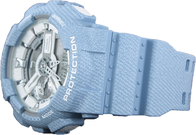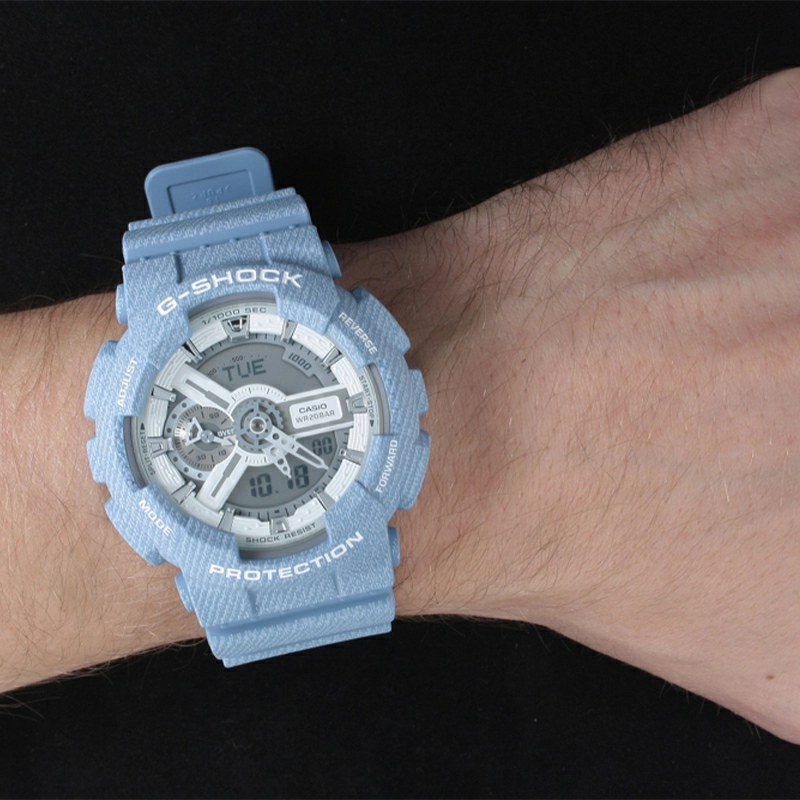 Đến từ BST G-SHOCK, mẫu đồng hồ GA-110DC-2A7DR sở hữu vẻ ngoài nổi bật với lớp áo màu xanh đẹp mắt. Bộ vỏ của đồng hồ được hoàn thiện với các đường gân chéo, mô phỏng lại lớp vải jeans gắn liền với các trang phục thường ngày.
