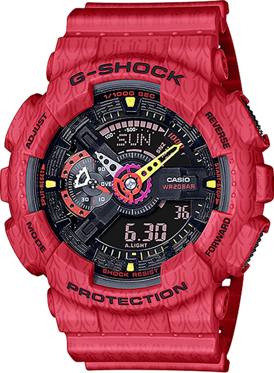Đến từ bộ sưu tập G-SHOCK, mẫu đồng hồ GA-110SGH-4ADR là thành quả của màn collab giữa Casio với Jahan Loh, một nghệ sỹ thị giác tại Singapore. Bắt tay với nhau, Jahan Loh tạo nên một bộ sưu tập đặc biệt, dựa trên nguyên mẫu của G-SHOCK nhưng thổi vào đó những màu sắc và triết lý nhân sinh của Á Đông, đặc biệt là quan niệm về Ngũ thường: Nhân, nghĩa, lễ, trí, tín.