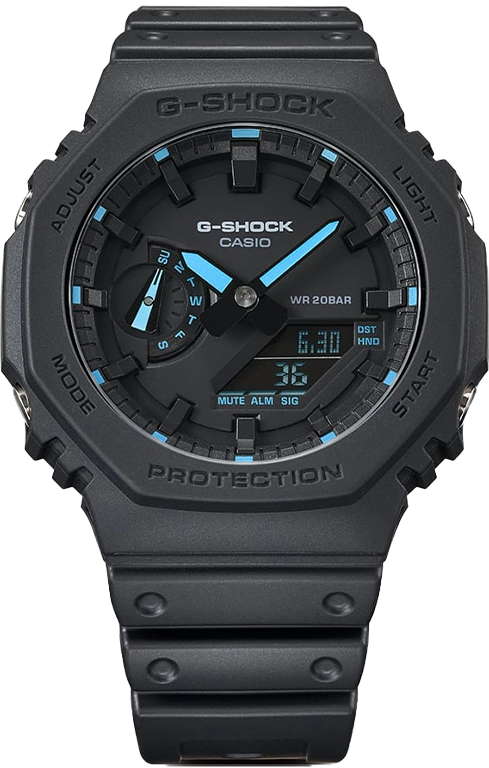 Với riêng mẫu đồng hồ GA-2100-1A2HDR, Casio mang đến cho sản phẩm của mình bộ vỏ làm từ nhựa cao cấp mang màu đen nhám cực kỳ nam tính. Sự khác biệt của GA-2100-1A2HDR so với những người anh em cùng dòng GA-2100 đến từ phần màu sắc của mặt số với những chi tiết mang màu xanh lạ mắt.
