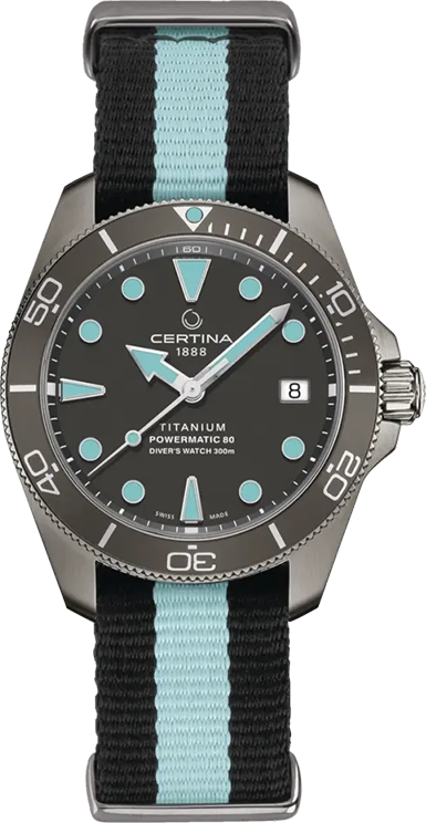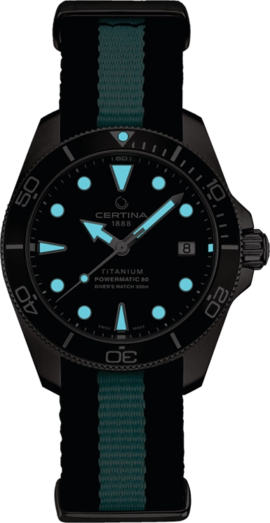 Cũng giống như những dòng đồng hồ lặn khác, C032.807.48.081.00 được Certina trang bị lớp phủ dạ quang Super-Luminova màu xanh lam đẹp mắt. Màu xanh này cũng tương đồng với màu sắc trên phần dây đeo vải dù của đồng hồ, mang lại trải nghiệm xuyên suốt trên cổ tay của bạn.