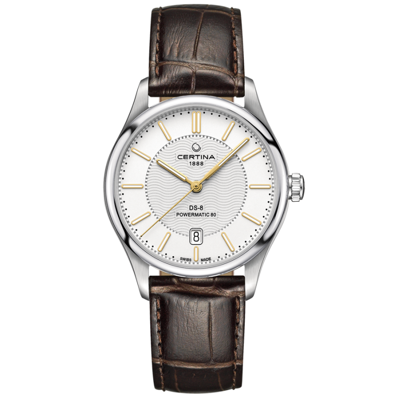 Điểm nhấn của C033.407.16.031.00 được Certina đặt trọn vào mặt đồng hồ, hoạ tiết sóng được chạm khắc lên trên mặt số tăng thêm chiều sâu. Bộ kim, cọc số màu trắng viền vàng sáng nổi bật trên mẫu dây da nâu. Tại điểm 6 giờ có hiển thị lịch ngày. Thông số bộ máy DS-8 Powermatic 80 với thời gian trữ cót lên tới 80 giờ cũng được chạm khắc trên mặt số.
