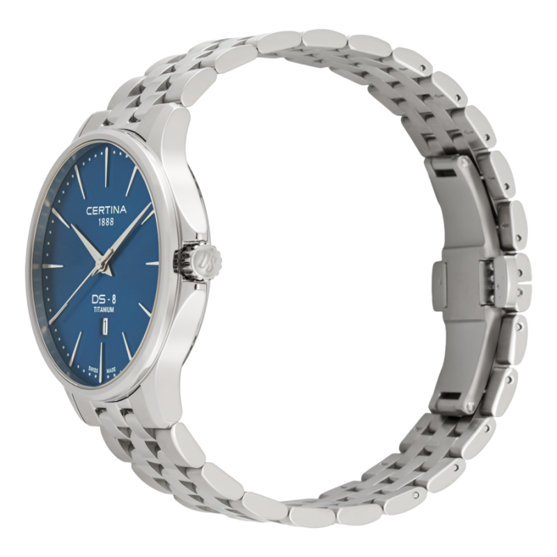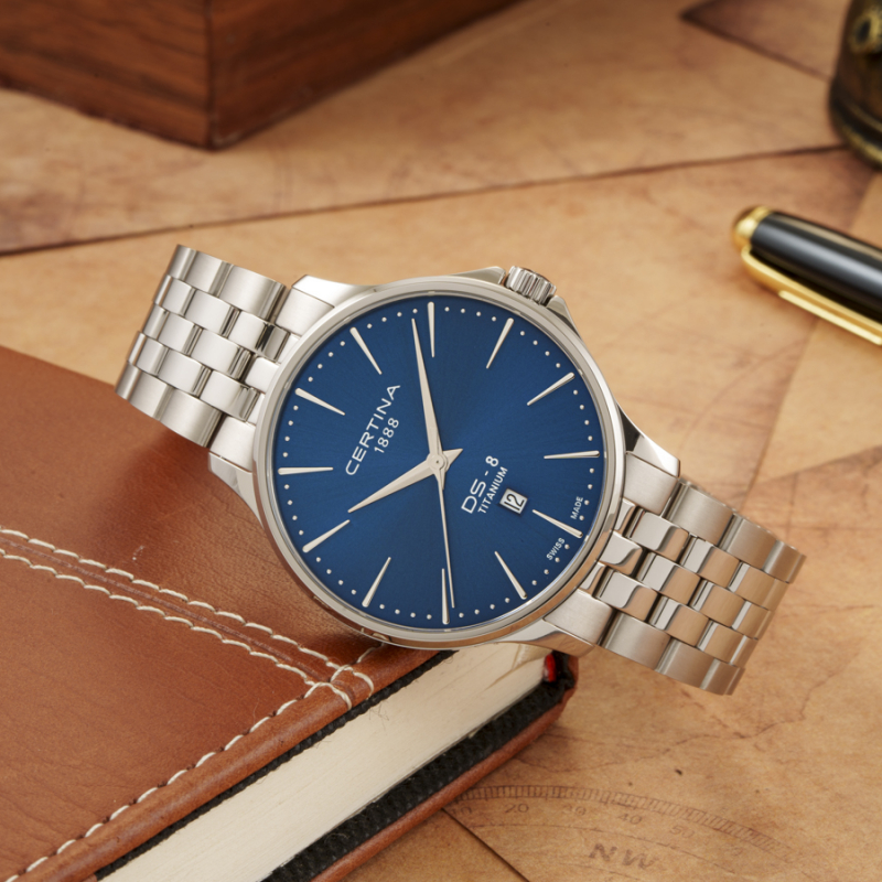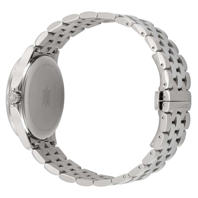 - Bố cục: Ô lịch ngày được đặt ngay ngắn tại vị trí 6 giờ, tạo nên sự cân bằng hoàn hảo cho mặt số. Các dòng chữ "CERTINA 1888", "DS-8 TITANIUM" và "SWISS MADE" được in sắc nét, khẳng định giá trị thương hiệu Thụy Sỹ.