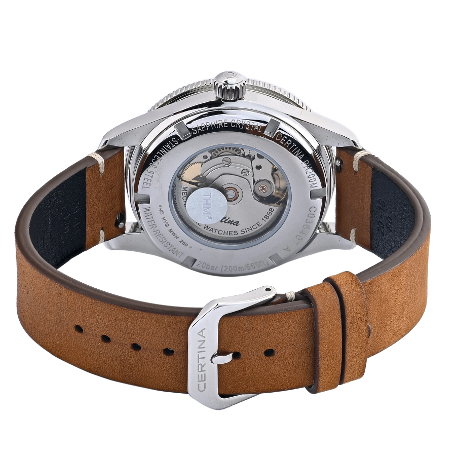 Khả năng chịu nước trên Certina C036.407.16.040.00 lên đến 20ATM nhờ vào thiết kế DS độc quyền của Certina.
