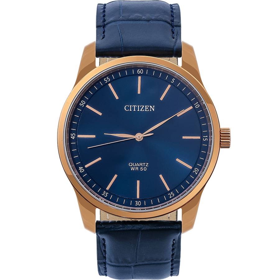 Ngay từ thời điểm ra mắt, đồng hồ nam Citizen BH5003-00L đã thu hút được phần lớn sự chú ý của phái mạnh khi sử dụng màu sắc làm tâm điểm khi kết hợp nền xanh đen lớp với mạ vàng. Mặt số thiết kế theo phong cách Minimalism, lược giản tối đa các chi tiết nhưng tạo điểm nhấn với nền xanh đen huyền bí. Các kim chức năng hình lá mềm mại và vạch giờ dạng vạch kẻ thanh mảnh đều mạ vàng nổi bật trên nền tối màu được làm đồng đều và cân đối với tổng thể. Bảo vệ mặt số là lớp kính khoáng cứng cáp có độ chịu lực vô cùng cao. Citizen đã đặt trọng tâm vào ba yếu tố: mỏng - nhẹ - bền để tô đậm sự đơn giản và nét sang trọng cho cỗ máy này. Viền bezel mạ vàng được làm mỏng và vát thoải ra ngoài tạo độ thoáng cho mặt số và làm nổi bật những chi tiết sắc sảo bên trong. Bộ case cứng cáp được đánh bóng tỉ mỉ với màu trắng bạc rất cuốn hút. Phần dây đồng hồ màu xanh cùng tông được dập vân cá sấu vấn tượng, tăng thêm vẻ nam tính cho chủ nhân. Ở góc 3 giờ là núm chỉnh giờ được thiết kế dạng nắp chai đơn giản và hỗ trợ thuận tiện cho thao tác chỉnh ngày và giờ. BH5003-00L được trang bị bộ máy Quartz chính hãng của Citizen bền bỉ và chính xác, có cấu tạo hoạt động không quá phức tạp, giúp các thao tác sử dụng dễ dàng hơn. BH5003-00L sở hữu kích thước 41mm và độ chống nước đạt 5ATM đủ để người dùng có thể sử dụng khi rửa tay, tắm cũng như di chuyển nhẹ dưới mưa.