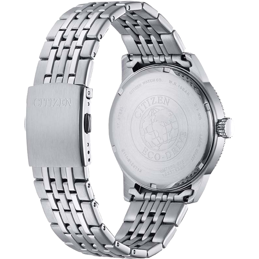 Đồng hồ nam Citizen Eco Drive BM7480-81L ghi điểm bởi ngoại hình mạnh mẽ dành cho những chàng trai yêu thích phong cách thể thao. Đây cũng là một trong những lựa chọn hàng đầu đối với những ai yêu thích sử dụng một sản phẩm xanh, bảo vệ được môi trường. Đúng như tên gọi của mình, BM7480-81L sử dụng công nghệ hiện đại Eco Drive độc quyền của Citizen, đạt chuẩn Japan Movt, cho phép người dùng có thể an tâm nạp năng lượng trên sản phẩm bằng bất kỳ nguồn ánh sáng nào. Ngoài ra, cỗ máy này cũng được trang bị tính năng tích hợp và chuyển tiếp năng lượng vào pin để tích trữ. Chính vì vậy mà những chiếc đồng hồ Eco Drive thường được đánh giá cao bởi tính tiện lợi cũng như góp phần bảo vệ môi trường của sản phẩm. Không chỉ an tâm về chất lượng, BM7480-81L gây ấn tượng bởi thiết kế mặt số đậm chất quân đội với nền màu xanh lá cây bắt mắt cùng viền bezel khía rãnh mạnh mẽ. Các cọc số Arab với kích thước lớn giúp thuận tiện cho người đeo quan sát giờ. Trung tâm mặt số là bộ kim sword chuyển động nhịp nhàng được phủ dạ quang có thể phát sáng vào ban đêm và những nơi thiếu sáng. Ô cửa sổ ngày tại vị trí 3h dù nhỏ nhắn nhưng hỗ trợ tích cực trong việc theo dõi thời gian. Bảo vệ toàn bộ mặt số là lớp kính khoáng có độ trong suốt cao và khả năng chịu lực tốt. Bộ case và dây đeo chế tác từ thép không gỉ 316L được đánh bóng hoàn thiện mang đến sự sang trọng cho BM7480-81L. Sản phẩm có đường kính mặt số 43mm và khả năng chống nước lên đến 10ATM giúp bạn hoàn toàn có thể an tâm khi sử dụng sản phẩm trong các hoạt động thể thao lẫn các hoạt động thường ngày.
