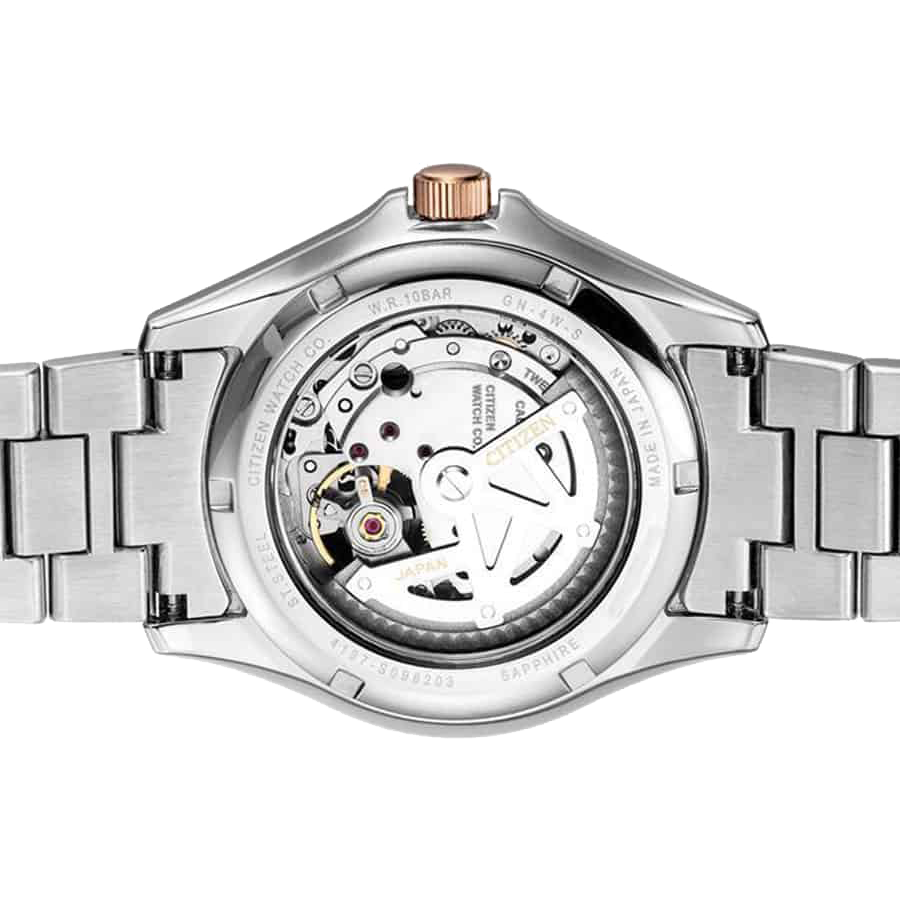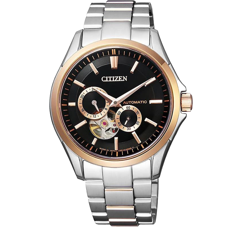 Nằm trong BST Citizen Automatic, NP1014-51E ghi điểm với người hâm mộ bởi ngoại hình nam tính, thời thượng cùng độ hoàn thiện trong từng chi tiết. Thiết kế của NP1010-01L là sự pha trộn hoàn hảo giữa sự hoài cổ và hiện đại với điểm nhấn là dial mang phong cách Multi Dial quen thuộc với đầy đủ chức năng cần thiết. Kim giờ và kim phút kiểu dáng Dauphine các các cọc số dạng vạch kẻ được mạ vàng nổi bật trên nền mặt số đen huyền bí. Kim giây được lược bỏ, thay vào đó được hiển thị tại ô kim phụ góc 5 giờ. Tại góc 9 giờ là ô giờ sáng tối, góc 7 giờ là ô lộ máy Open Heart cực kỳ ấn tượng giúp người dùng có thể dễ dàng chiêm ngưỡng quá trình lên cót và hiệu ứng ánh sáng của các viên chân kính. Với rất nhiều chi tiết, Citizen vẫn biết cách bố cục một cách hài hòa không gây rối mắt, mang lại cảm giác gọn gàng, dễ chịu. Cỗ máy này được trang bị lớp kính Sapphire cao cấp ở cả mặt trước và mặt sau mang đến độ bền vượt trội cho đồng hồ. Không chỉ đầu tư về ngoại hình, NP1014-51E còn được trang bị những chất liệu cao cấp nhất. Toàn bộ bộ vỏ đều được làm từ thép không gỉ cao cấp 316L với độ cứng cáp cao bảo vệ tuyệt đối cho các chi tiết máy bên trong. Dây đeo bằng kim loại đã được chải xướng tạo hiệu ứng đẹp mắt và dễ dàng có thể vệ sinh thường xuyên. Trái tim của NP1014-51E là bộ máy In House Caliber 4197 tinh xảo và bền bỉ với 21 chân kính và thời gian trữ cót tới 40 giờ. Đường kính 40mm và độ chống nước đạt 10ATM giúp các chàng trai có thể thoải mái trong các hoạt động hàng ngày.