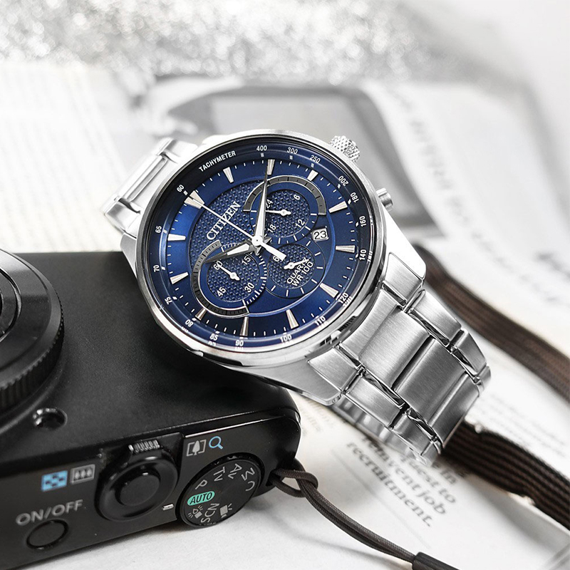 Khác với những mẫu đồng hồ thể thao hầm hố thường thấy, Citizen Chronograph AN8190-51L gây ấn tượng với phong cách thiết kế tối giản mang đến cảm giác về những chàng trai hiện đại, thanh lịch. Vẫn là đồng hồ dáng tròn truyền thống, Citizen biết cách tạo điểm nhấn với mặt số xanh sapphire thời thượng cùng cách sắp xếp 3 mặt số phụ thể hiện chức năng Chronograph giao thoa với nhau tạo nên một họa tiết trang trí độc đáo. Các cọc số dạng vạch kẻ và bộ kim chỉ giờ được vót nhọn đều tạo hình thanh mảnh và phủ dạ quang bạc khiến dial dù nhiều chi tiết nhưng vẫn không hề nặng nề, đồng thời, mang đến trải nghiệm xem giờ dễ dàng hơn, kể cả trong điều kiện thiếu sáng. Ô cửa sổ ngày nhỏ nhắn tại vị trí 4h giúp chủ nhân bao quát thời gian một cách dễ dàng. Tất cả các chức năng này đều được các nhà sáng tạo tài ba của Citizen sắp xếp một cách hài hoà, hợp lý, giữ được độ thoáng cho tổng thể.