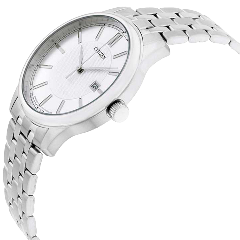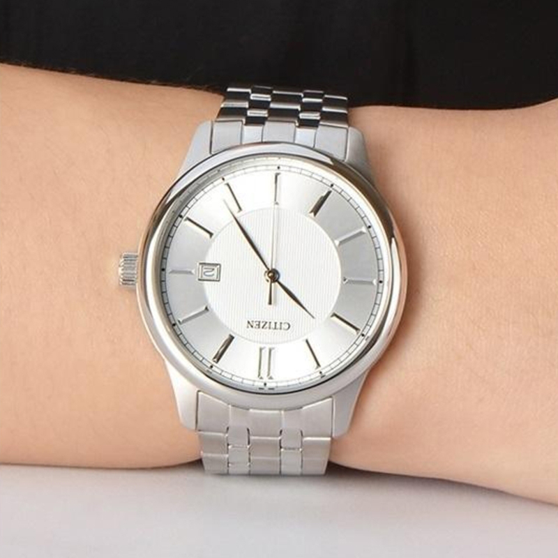 Đồng hồ nam Citizen BI1050-56A với ngoại hình lịch lãm, bắt mắt, đặc biệt phù hợp cho những chàng trai công sở. Sử dụng màu trắng làm chủ đạo cho toàn bộ tổng thể nhưng không vì thế mà BI1050-56A trở nên nhạt nhòa khi sở hữu mặt số cực kỳ nam tính với thiết kế hai lòng độc đáo, phần bên trong là những họa tiết sọc kẻ tạo chiều sâu. Cọc số dạng dạng mảnh nổi khối cùng bộ kim baton mạnh mẽ được đánh bóng tỉ mỉ, sắc nét và phủ một lớp dạ quang để thuận tiện quan sát thời gian trong điều kiện thiếu sáng. Tại góc 3 giờ, lịch ngày được bố trí nhỏ nhắn giúp các chàng trai thuận tiện trong sắp xếp công việc. Bảo vệ mặt số là lớp kính khoáng cứng cáp giúp bảo vệ đồng hồ khỏi các tác động vật lý nhờ có độ chịu lực vô cùng cao.