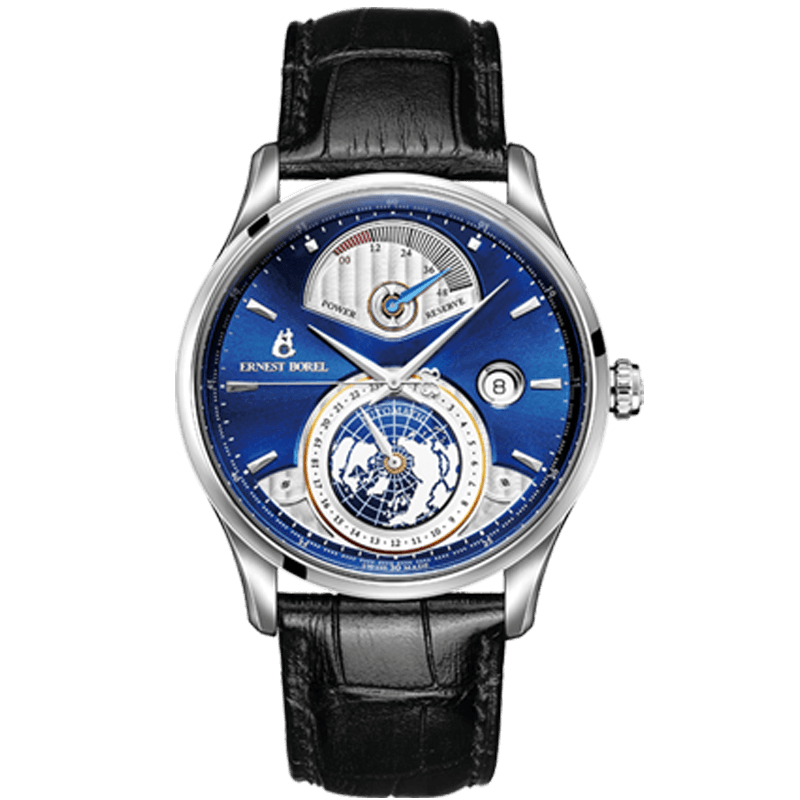 GS2101-611BK có đường kính mặt số tiêu chuẩn 42mm. Với kích thước này, Ernest Borel đã hiển thị các chức năng của GS2101-611BK theo cách đặc biệt. Nửa trên của mặt số hiển thị khả năng trữ cót lên tới 48 giờ của cỗ máy, bằng cách tạo dải đếm theo khuôn hình dải quạt, kim chỉ màu xanh lùi dần theo các số 48, 36, 24, 12 và 00 giờ trữ cót tương ứng. Nhờ đó, người dùng có thể dễ dàng nắm bắt được mức trữ cót của cỗ máy trên đồng hồ. Ở nửa dưới của mặt số, Ernest Borel đã đưa vào hình quả địa cầu và vòng tròn hiển thị 24 giờ cực kỳ ấn tượng.