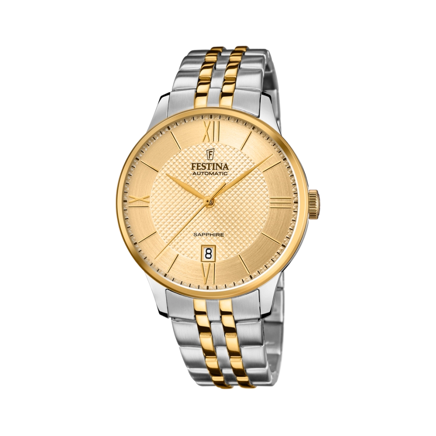 F20483/1 ghi điểm trong lòng giới hâm mộ bởi ngoại hình chỉn chu và đầy lịch lãm của mình. Sở hữu cho mình bộ vỏ bằng thép không gỉ cao cấp 316L phối hợp hài hoà với đường line vàng điểm nhấn ở dây đeo, F20483/1 dù đơn giản nhưng không hề gây nhàm chán với người đối diện khi chiêm ngưỡng. Mặt số và bộ kim chỉ giờ được phủ sắc vàng kim, các cọc số La Mã cổ điển và hoạ tiết vân nổi ở lòng mặt số chính là những chi tiết đắt giá tạo nên độ chỉn chu và ấn tượng cho F20483/1. Ô cửa số ngày được đặt tại vị trí 6h giúp chủ nhân có thể theo dõi thời gian một cách dễ dàng hơn. Một chi tiết đáng giá khác trên F20483/1 là lớp kính sapphire giúp bảo vệ khu vực mặt số có đường kính là 41.5mm. Đây cũng là kích thước vừa vặn với cổ tay của đàn ông châu Á, giúp việc đeo trên tay chiếc đồng hồ này luôn mang lại sự thoải mái. Trái tim của đồng hồ là bộ chuyển động tự động với cơ chế hoạt động bền bỉ, chính xác. Festina đã trang bị cho F20483/1 khả năng chống nước lên tới 5ATM, giúp các chàng trai có thể thoải mái trong các hoạt động sinh hoạt hàng ngày, dù rửa tay hay đi mưa.