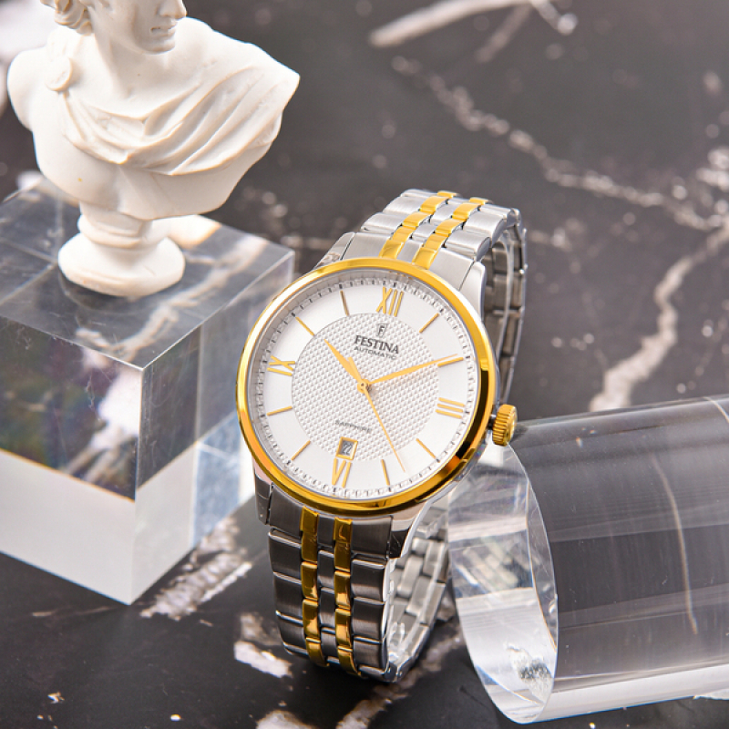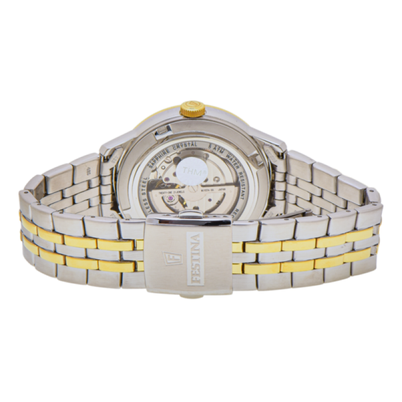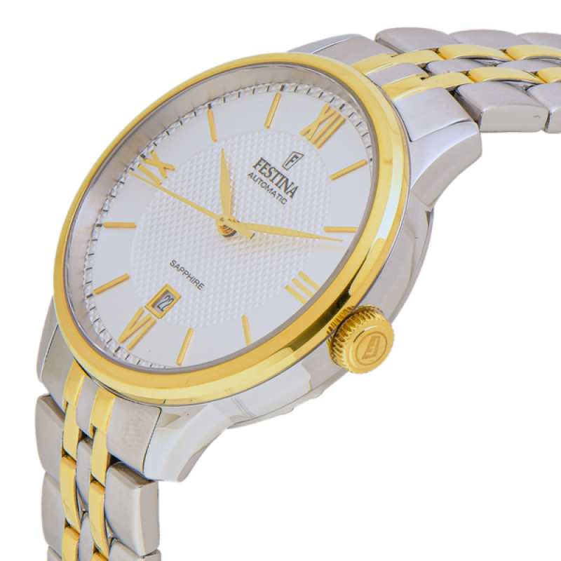 F20483/4 ghi điểm trong lòng giới hâm mộ bởi ngoại hình chỉn chu và lịch lãm. Sở hữu cho mình bộ vỏ bằng thép không gỉ cao cấp 316L phối màu demi hài hoà, F20483/4 dù đơn giản nhưng không hề gây nhàm chán và xứng đáng là chiếc đồng hồ mà bạn có thể diện hàng ngày. Cọc số La Mã và bộ kim chỉ giờ được phủ màu vàng kim nổi bật trên nền mặt số trắng cùng hoạ tiết vân nổi ở lòng mặt số chính là những chi tiết mang đến sự ấn tượng cho F20483/4. Ô cửa số ngày được đặt tại vị trí 6h giúp chủ nhân có thể theo dõi thời gian một cách dễ dàng hơn. Lớp kính Sapphire chống xước cao cấp được trang bị trên F20483/4 giúp bảo vệ mặt số có đường kính là 42mm của đồng hồ. Trái tim của F20483/4 là bộ chuyển động tự động với cơ chế hoạt động bền bỉ, chính xác. Festina đã trang bị cho F20483/4 khả năng chống nước lên tới 5ATM, giúp các chàng trai có thể thoải mái trong các hoạt động sinh hoạt hàng ngày, dù rửa tay hay đi mưa.