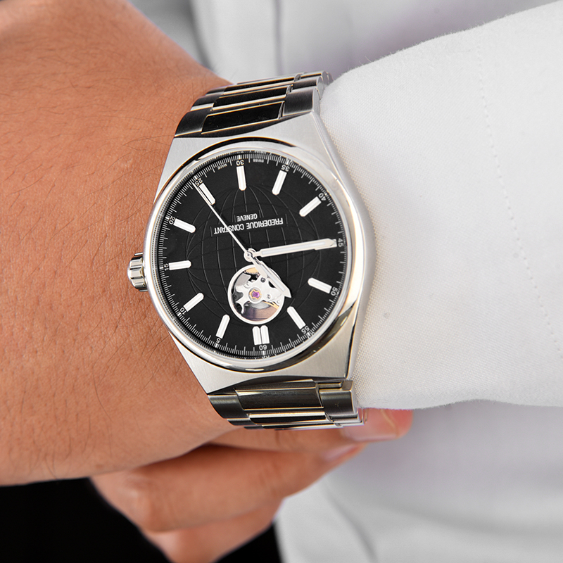 Đồng hồ Frederique Constant FC-310B4NH6B sở hữu thiết kế mặt số lộ một phần máy ở vị trí 12h giúp những người yêu thích đồng hồ thỏa mãn việc ngắm nhìn những chuyển động mượt mà của cỗ máy thời gian này. Hình ảnh quả địa cầu được thể hiện bằng những đường kinh tuyến, vĩ tuyến trên mặt dial càng tạo sự ấn tượng cho FC-310B4NH6B.