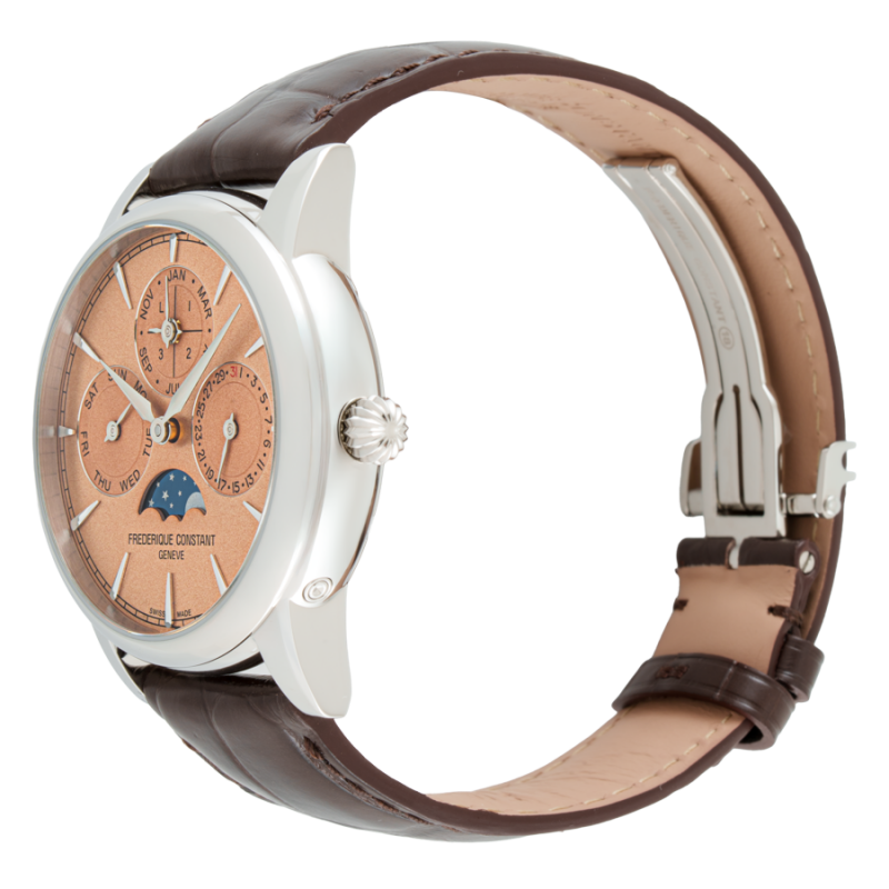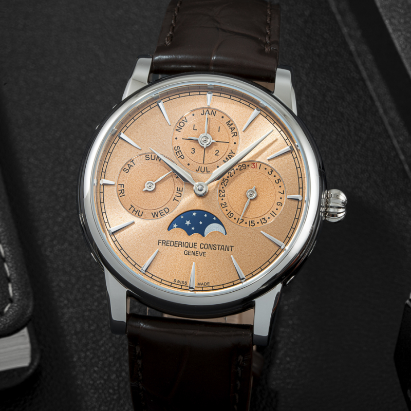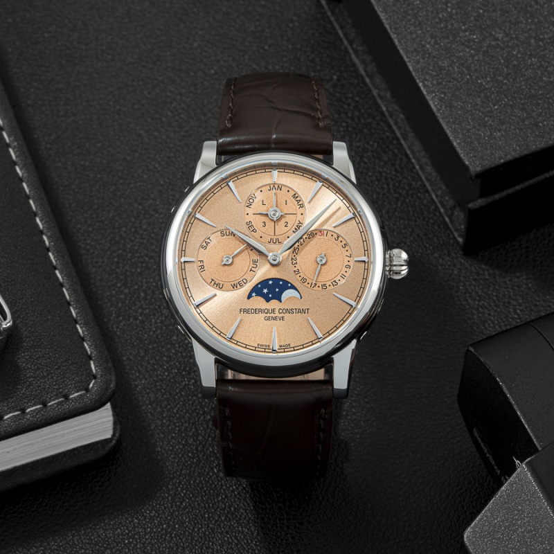 Frederique Constant FC-776SAL3H6 là mẫu đồng hồ đặc biệt, hội tụ đầy đủ các tiêu chí làm nên một chiếc Dress Watch cao cấp cho giới mộ điệu: tinh xảo, truyền thống và đậm tính cơ khí. Điểm đầu tiên khiến sản phẩm nổi bật là sự xuất hiện của lịch vạn niên (Perpetual Calendar) – tính năng chỉ dành cho những bộ máy cơ phức tạp bậc nhất. Không chỉ hiển thị ngày, tháng, thứ mà còn tự động điều chỉnh năm nhuận, lịch vạn niên thể hiện trình độ chế tác vượt trội chỉ những nhà sản xuất đồng hồ Thụy Sỹ mới có thể tạo ra.