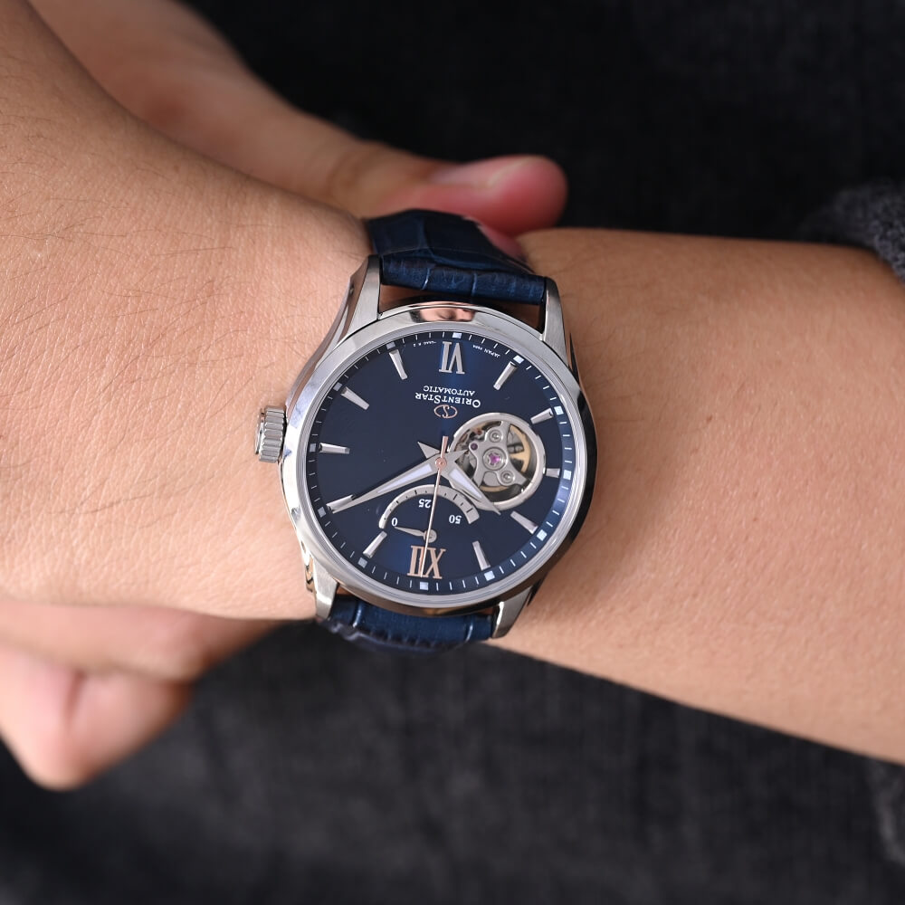 Orient RE-AT0006L00B sở hữu mặt số màu xanh đen tinh tế với thiết kế semi skeleton, kim bạc quyến rũ phủ dạ quang, tại góc 12h là mặt số phụ thông báo mức dự trữ năng lượng đặc trưng của dòng sản phẩm Orient Star.