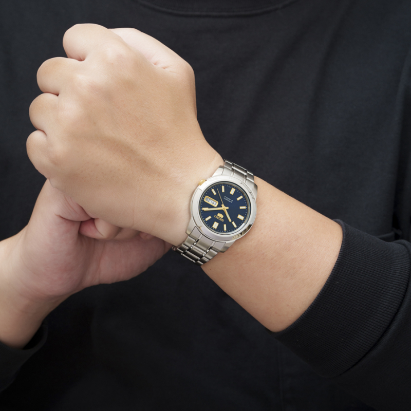 Sản phẩm sở hữu mặt số màu xanh bắt mắt, tạo nên chiều sâu về mặt thị giác và hỗ trợ việc quan sát thời gian trở nên thú vị hơn trong quá trình sử dụng. Với thiết kế mặt tròn kinh điển đi kèm đường kính mặt 38mm, đồng hồ mang lại vẻ ngoài lịch sự, tinh tế và đảm bảo tính cân đối khi hiện diện trên cổ tay người sử dụng. Các chi tiết hiển thị quan trọng như hệ thống kim và các cọc số được hoàn thiện với độ sắc nét cao, kết hợp cùng tính năng dạ quang tích hợp sẵn trên các chi tiết này giúp tối ưu khả năng hiển thị thời gian một cách chính xác trong nhiều môi trường ánh sáng khác nhau, kể cả trong điều kiện thiếu sáng. Phần khung vỏ được gia công tỉ mỉ, mịn màng với tông màu bạc chủ đạo, không chỉ giúp đồng hồ có độ bắt sáng ổn định mà còn góp phần tăng giá trị thẩm mỹ tổng thể cho người đeo khi kết hợp cùng trang phục.