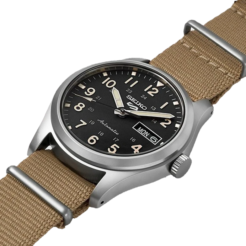 Nằm trong BST Seiko 5 Sports, SRPG35K1 sở hữu vẻ ngoài ấn tượng với đường kính 39,4mm dành riêng cho người có cổ tay nhỏ. SRPG35K1 được kết hợp hài hoà giữa màu nâu vàng của dây đeo nato cao cấp. Khoác trên mình tone nâu đầy bụi bặm, dây đeo Nato cao cấp và viền mặt tạo nên nét đặc trưng của bộ sưu tập, SRPG35K1 đặc biệt phù hợp với những chàng trai năng động, ưu thích khám phá. Các chi tiết như cọc số và bộ kim được phủ dạ quang ánh vàng nổi bật trên nền mặt số đen, giúp người dùng có thể dễ dàng theo dõi thời gian ngay cả trong bóng tối.