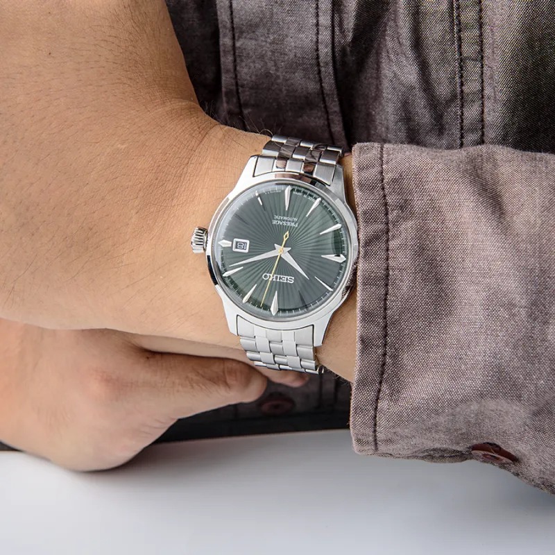 Seiko trình làng khá nhiều dòng sản phẩm với dải giá rộng nhằm đáp ứng nhu cầu của đa dạng khách hàng. Nằm trong dòng sản phẩm Presage Cocktail,SRPE15J1 là mẫu đồng hồ dành cho phái mạnh với thiết kế sang trọng, là một trong những sự lựa chọn nặng ký trong khoảng giá trên 10 triệu đồng.