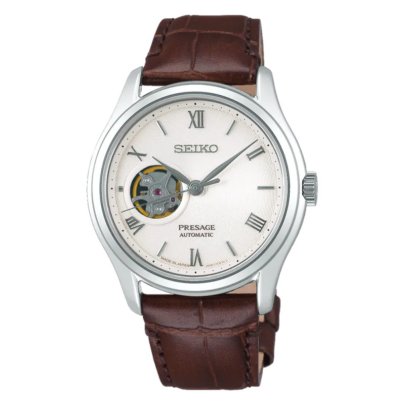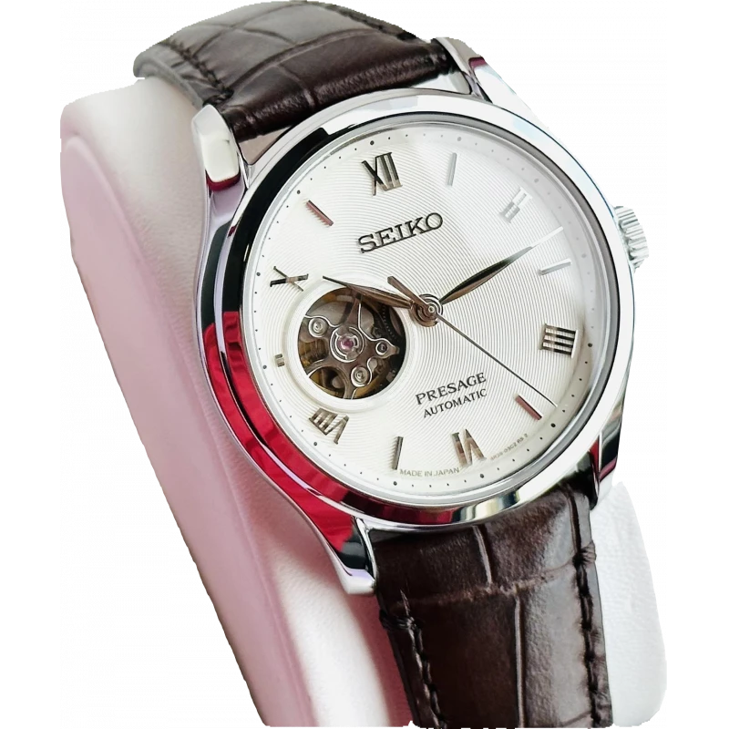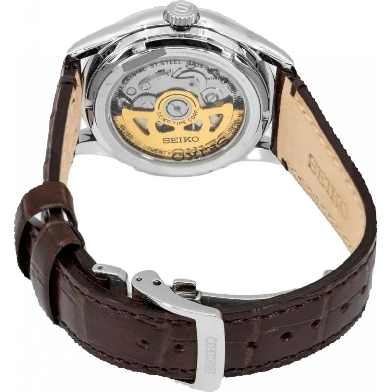 Seiko SSA413J1 gây ấn tượng mặt số chải vân đồng tâm màu trắng ngà. Tại góc 9h của mặt số là cửa sổ lộ cơ, giúp người dùng thỏa mãn ngắm nhìn chuyển động mượt mà của bộ máy. Bộ vỏ của Seiko SSA413J1 được chế tác từ chất liệu thép không gỉ 316L cao cấp, chống oxy hóa và chịu ăn mòn tốt. Bảo vệ cho mặt số Seiko SSA413J1 là lớp kinh sapphire cong cao cấp có khả năng chống trầy xước tốt, có độ trong suốt cao. Dây đeo làm từ da màu nâu mang đến sự hài hòa với mặt số. Đặc biệt, đường kính dial chỉ 38,3mm của đồng hồ kết hợp với phối màu cơ bản đã đem lại vẻ đẹp cổ điển, phảng phất chất vintage nơi cổ tay của người đeo.
