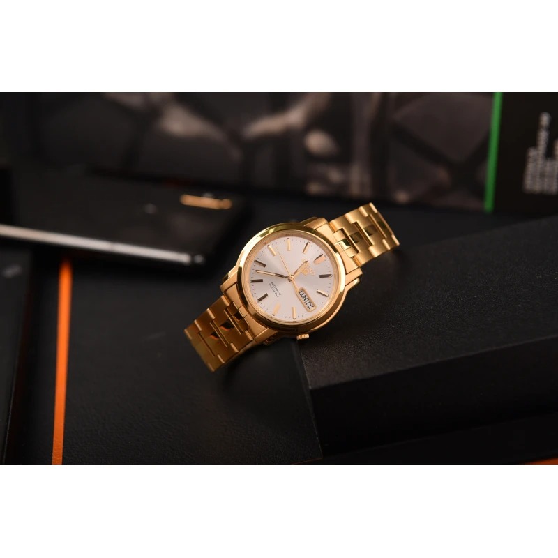 SNKK74K1S là mẫu đồng hồ dành cho nam giới, với màu chủ đạo là màu vàng ở mặt số, vỏ và dây cách điệu làm tôn lên vẻ sang trọng, lịch lãm. Vỏ và dây được mạ vàng cao cấp với đường kính 38mm, phù hợp với đa số cổ tay các anh em với ưu điểm không bị kén màu da. Mặt kính được làm bằng kính cứng khó trầy xước, giữ đồng hồ luôn trông như mới. Bộ kim và cọc số thanh mảnh, phủ lớp dạ quang nổi bật trên nền trắng bắt mắt.Lịch ngày, lịch thứ đặt gọn tại góc 3h. Độ chịu nước lên đến 3ATM của Seiko SNKK74K1S là mức độ trung bình thích hợp chống nước cho việc rửa tay, đi mưa.