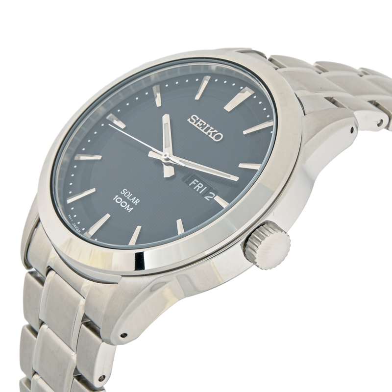 Nằm trong dòng sản phẩm Solar của Seiko, SNE363P1S là mẫu đồng hồ dành cho nam giới với thiết kế đơn giản, thanh lịch đúng chất người Nhật. Toàn bộ phần vỏ và dây đeo của SNE363P1S được sản xuất từ thép không gỉ 316L cao cấp, thân thiện với người dùng và giữ được độ sáng bóng tốt theo thời gian. Đường kính mặt số của SNE363P1S là 43mm, tuy nhiên thì với chiều dài từ hai đầu lug khá ngắn, cảm giác đeo trên cổ tay của SNE363P1S vẫn rất tốt. Mặt số của SNE361P1S mang màu đen, mang tới sự hài hòa cho tổng thể đồng hồ cũng như sự dễ đeo cho người dùng. Các cọc số của SNE363P1S được làm với dạng cọc vạch, dễ nhìn, phủ dạ quang hỗ trợ quan sát thời gian trong điều kiện ánh sáng yếu. Ở góc 3h của SNE363P1S, Seiko cung cấp cho người dùng lịch thứ và lịch ngày tiện lợi.