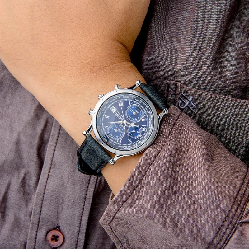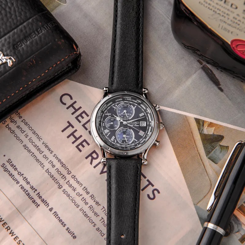 Nằm trong dòng sản phẩm World Time, đồng hồ SPL059P1 mang trên mình thiết kế ấn tượng, được đánh giá là một trong những mẫu đồng hồ đáng sở hữu nhất của Seiko. Đúng với tên gọi của mình, dial của SPL059P1 nổi bật với tên của 24 thành phố lớn trên thế giới, nằm trải đều trên vòng tròn ở lớp ngoài cùng, tương ứng với 24 múi giờ của Trái Đất. Mặt số của đồng hồ khá phức tạp với 8 cây kim và 3 mặt số phụ. Trong đó, mặt số phụ nằm ở góc 12h dùng để thể hiện giờ và phút của múi giờ thứ hai, mặt số phụ nằm ở góc 6h dùng để chỉnh báo thức và mặt số phụ ở góc 9h dành cho kim giây. Đây là một điểm vô cùng đặc biệt mà người dùng cần phải hết sức lưu ý khi sử dụng SPL059P1. Chiếc kim dài nằm tại vị trí trung tâm cùng kim giờ và kim phút dùng để chỉ múi giờ thứ hai do người dùng lựa chọn. Chủ nhân của SPL059P1 có thể lựa chọn múi giờ thứ hai này thông qua núm crown và hai nút bấm phía bên hông của bộ vỏ. Các nút bấm này cũng được chế tác đẹp mắt, mang hơi hướng của những cỗ máy vintage.