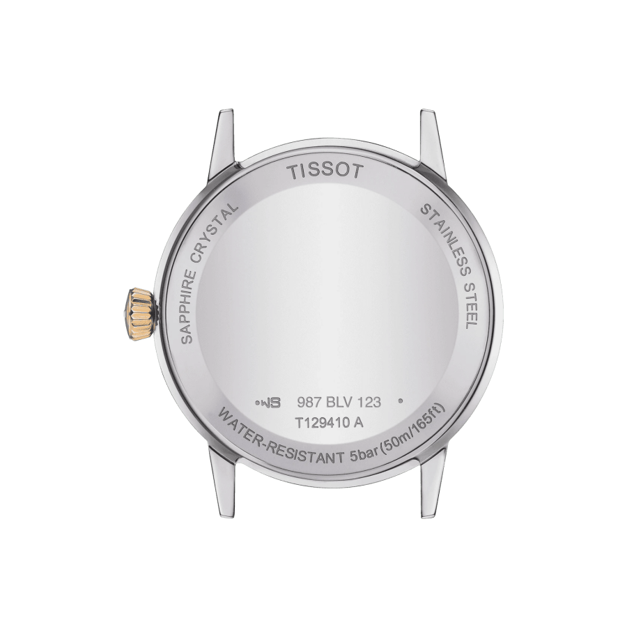 Vỏ khung của T129.410.26.263.00 được làm từ thép không gỉ, mạ vàng công nghệ PVD. Đồng hồ Tissot T129.410.26.263.00 có đường kính 42mm, phù hợp với các quý ông có cổ tay trung bình và lớn. Mặt số có nền màu trắng ngà, tại trung tâm vị trí 12 giờ hiển thị logo thương hiệu. Cọc số La Mã bản nhỏ màu đen. Bộ kim mạ vàng tạo nên sức hút trong từng chuyển động. Tại vị trí 3 giờ hiển thị lịch ngày. Các vạch phút màu đen ở vòng tròn sát vỏ khung tạo nên điểm nhấn cho tổng thể.
