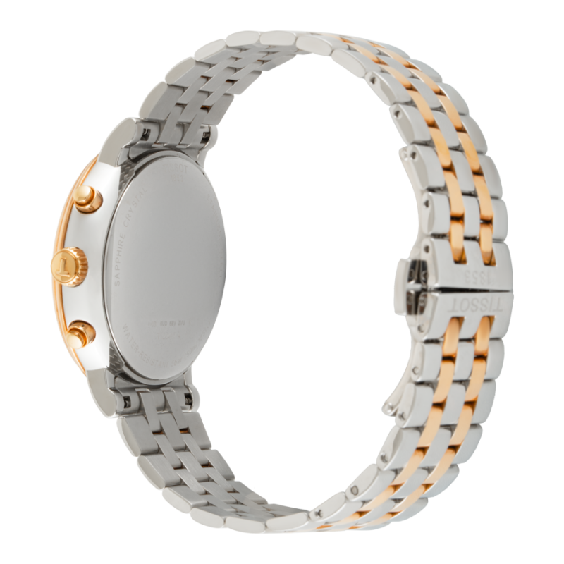Vỏ khung và dây đeo của T122.417.22.011.00 được làm từ thép không gỉ, mạ vàng hồng demi công nghệ PVD. Mẫu đồng hồ mặt tròn có đường kính 40mm. Mặt số có nền màu trắng, khu vực trung tâm hiển thị logo thương hiệu, cửa sổ hiển thị lịch ngày ở vị trí 4 giờ, bộ ba kim và ba mặt đồng hồ phụ hiển thị chức năng bấm giờ, kim giây. Cọc số dạng vạch đơn, dòng chữ “Swiss Made" ở vị trí 6 giờ. Cọc số và bộ kim là các chi tiết mạ vàng hồng tạo điểm nhấn. Tính năng EOL cảnh báo năng lượng pin sắp hết và cần thay thế khi kim giây nhảy cóc.