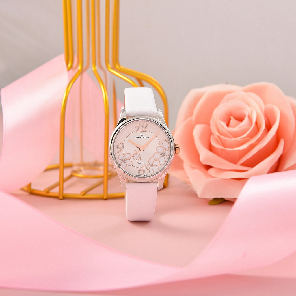 Là một trong số những sản phẩm của Lady Elegance Collection, C4720/1 gây sự chú ý toàn diện khi mang ngoại hình vô cùng nữ tính. Điểm hút mắt nhất của sản phẩm này chính là mặt số vô cùng sinh động, giống như được các nhà thiết kế phác thảo lại một vườn hoa đang nở rộ vào mùa xuân. C4720/1 mang trên tone trắng tinh khôi, các hoạ tiết của sản phẩm được hạn chế tối đa để tập trung vào điểm nhấn nơi mặt số. Cọc số và các hoạ tiết bông hoa được làm bằng xà cừ và đính đá zirconia, viền phớt hồng càng tôn lên thanh lịch và nữ tính của chủ nhân khi mang.