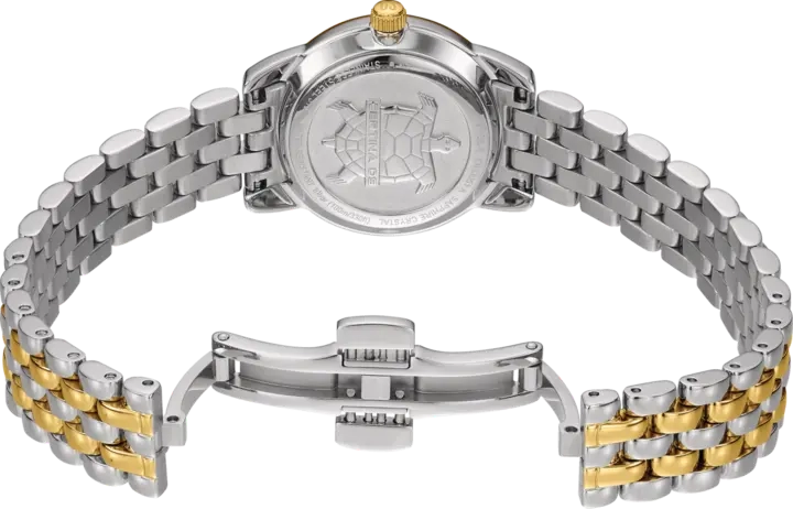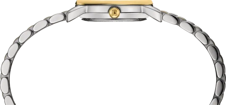 C033.051.22.118.01 thực sự gây được thiện cảm với vẻ ngoài nữ tính, được nên bởi bộ vỏ thép mạ demi vàng, hoàn thiện sáng bóng với những mắt dây nhỏ xinh của mình.