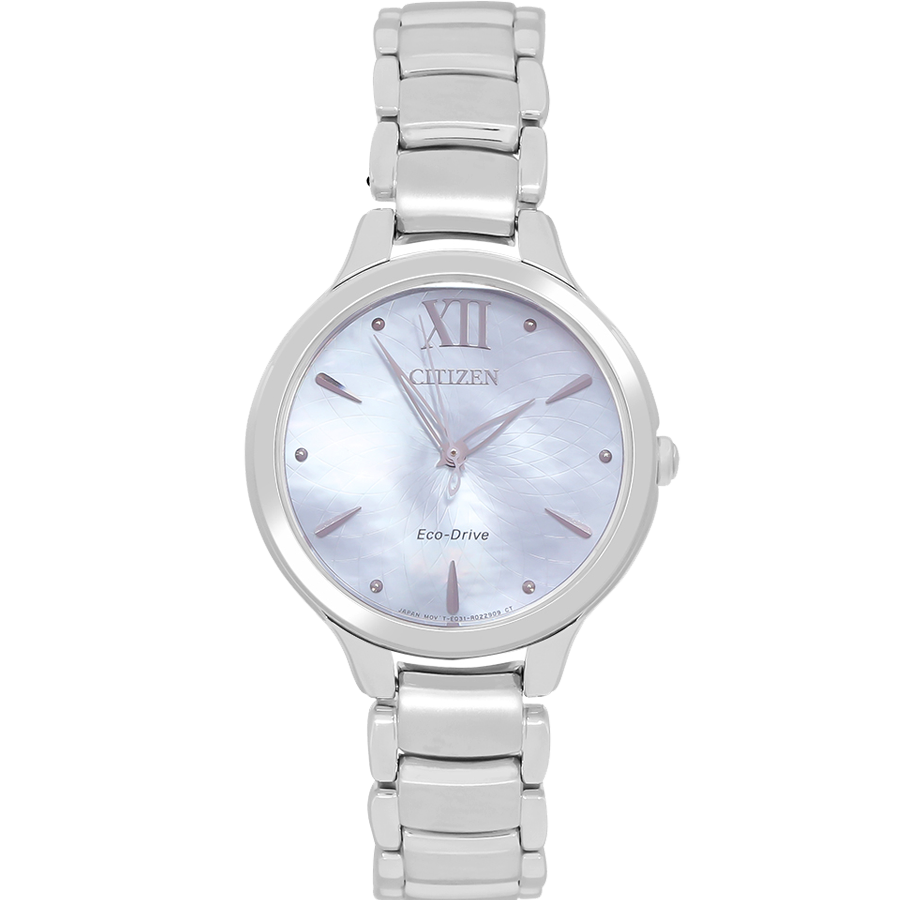 Nằm trong bộ sưu tập Citizen Ladies, EM0550-83N được phái đẹp ưa chuộng chính bởi thiết kế sang trọng và khác biệt. Chỉ sử dụng tông trắng bạc làm màu sắc chủ đạo cho toàn bộ chi tiết của EM0550-83N, Citizen vẫn biết cách làm nên sự độc đáo ở một vài chi tiết nhấn nhá. Vẫn là hình dáng tròn cổ điển khá thường thấy thế nhưng điểm đặc biệt của đồng hồ lại nằm ở mặt số bên trong với nền dial xà cừ bắt mắt. Để giữ độ thoáng cho dial, các chi tiết được lược giản và thu gọn một cách tối đa, chỉ giữ lại bộ kim và các cọc số dạng vạch kẻ, chấm tròn đan xen và cũng được mạ một lớp trắng bạc cùng tông với tổng thể. Bảo vệ toàn bộ dial là lớp sapphire trong suốt có khả năng chống va đập tốt, giúp các nàng yên tâm khi đeo trên cổ tay. Không chỉ có ngoại hình ấn tượng, EM0550-83N còn được Citizen trang bị bộ máy Eco-drive độc quyền, sử dụng nguồn năng lượng xanh như ánh nắng mặt trời, ánh sáng nhân tạo, chuyển hóa thành năng lượng để cung cấp cho mọi hoạt động trực tiếp của đồng hồ, phần còn lại được chuyển vào viên pin để dự trữ. Với mỗi lần sạc đầy, chiếc đồng hồ này có thể hoạt động lên đến 8 tháng trong điều kiện không có ánh sáng và viên pin dự trữ có tuổi thọ đến 10 năm, hạn chế được một lượng lớn pin thải ra hàng năm, góp phần bảo vệ môi trường. Mức chịu nước của đồng hồ đạt 5ATM cho phép phái đẹp có thể dễ dàng sử dụng trong các hoạt động thường ngày như rửa tay, đi mưa…
